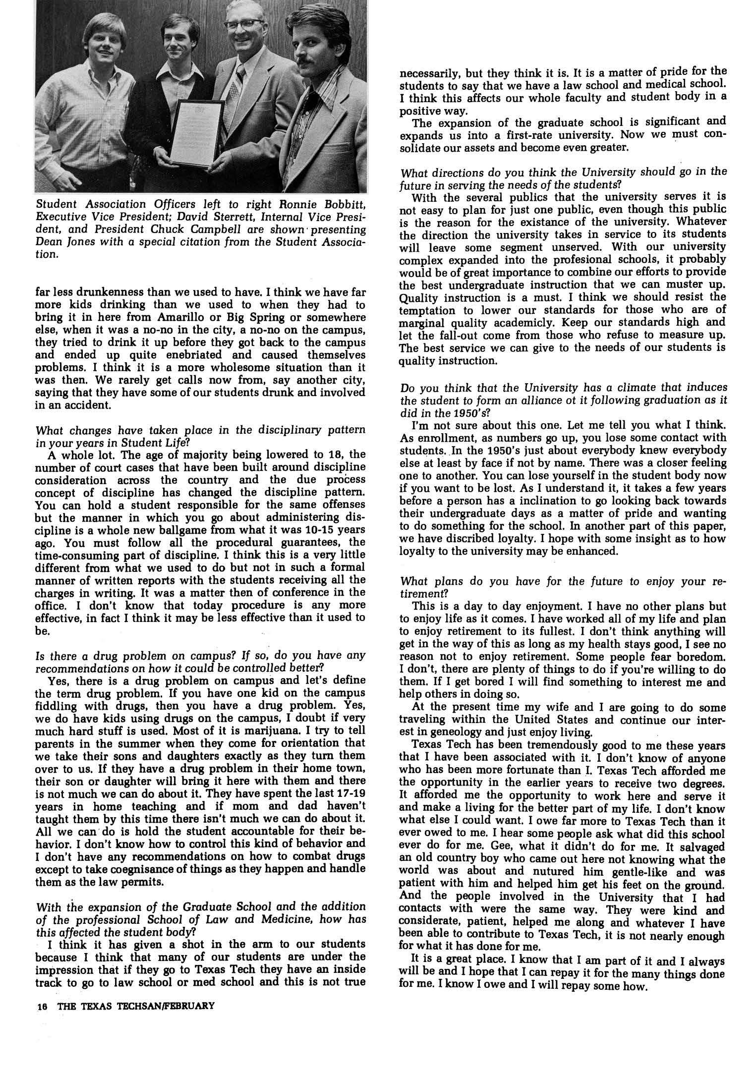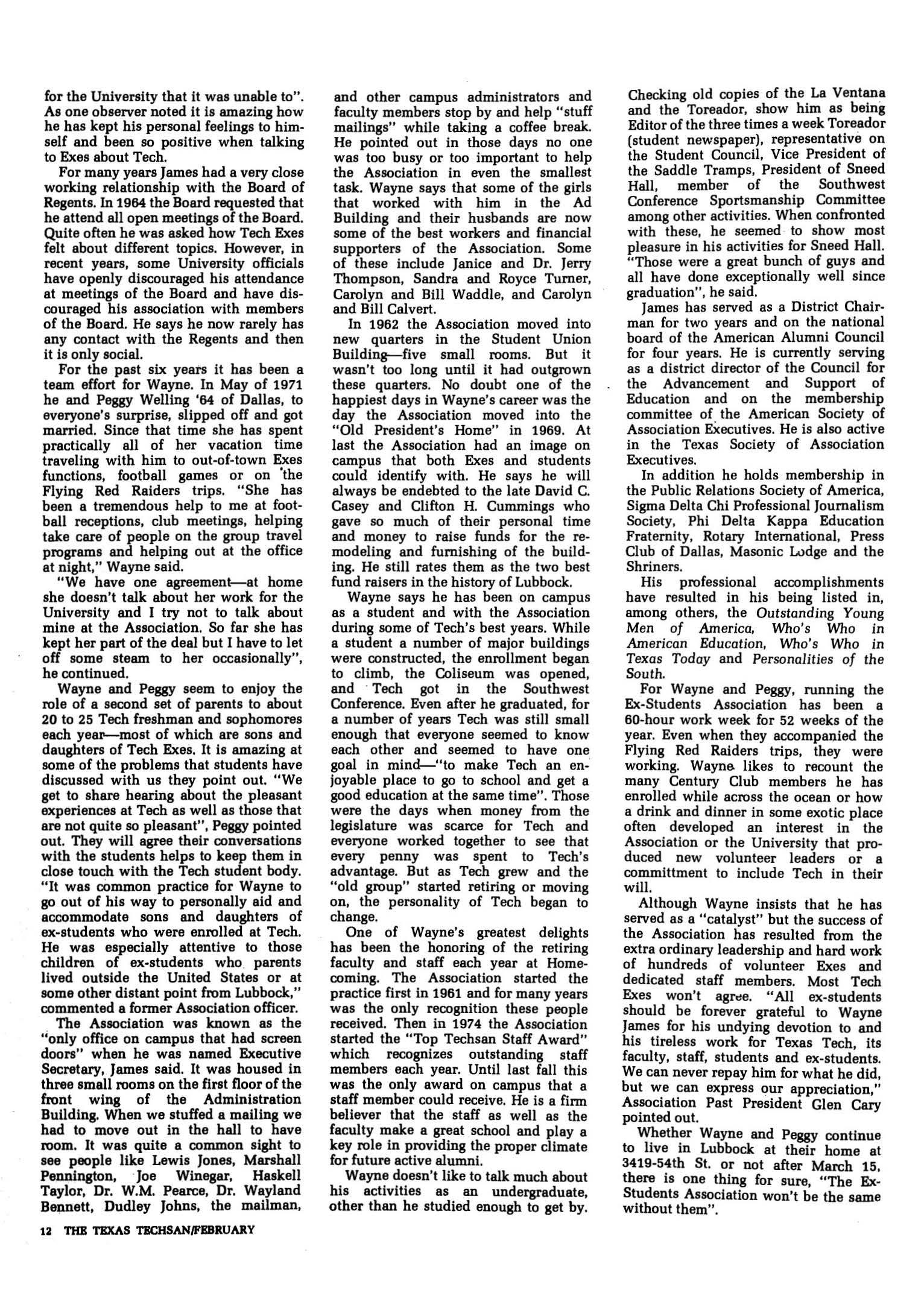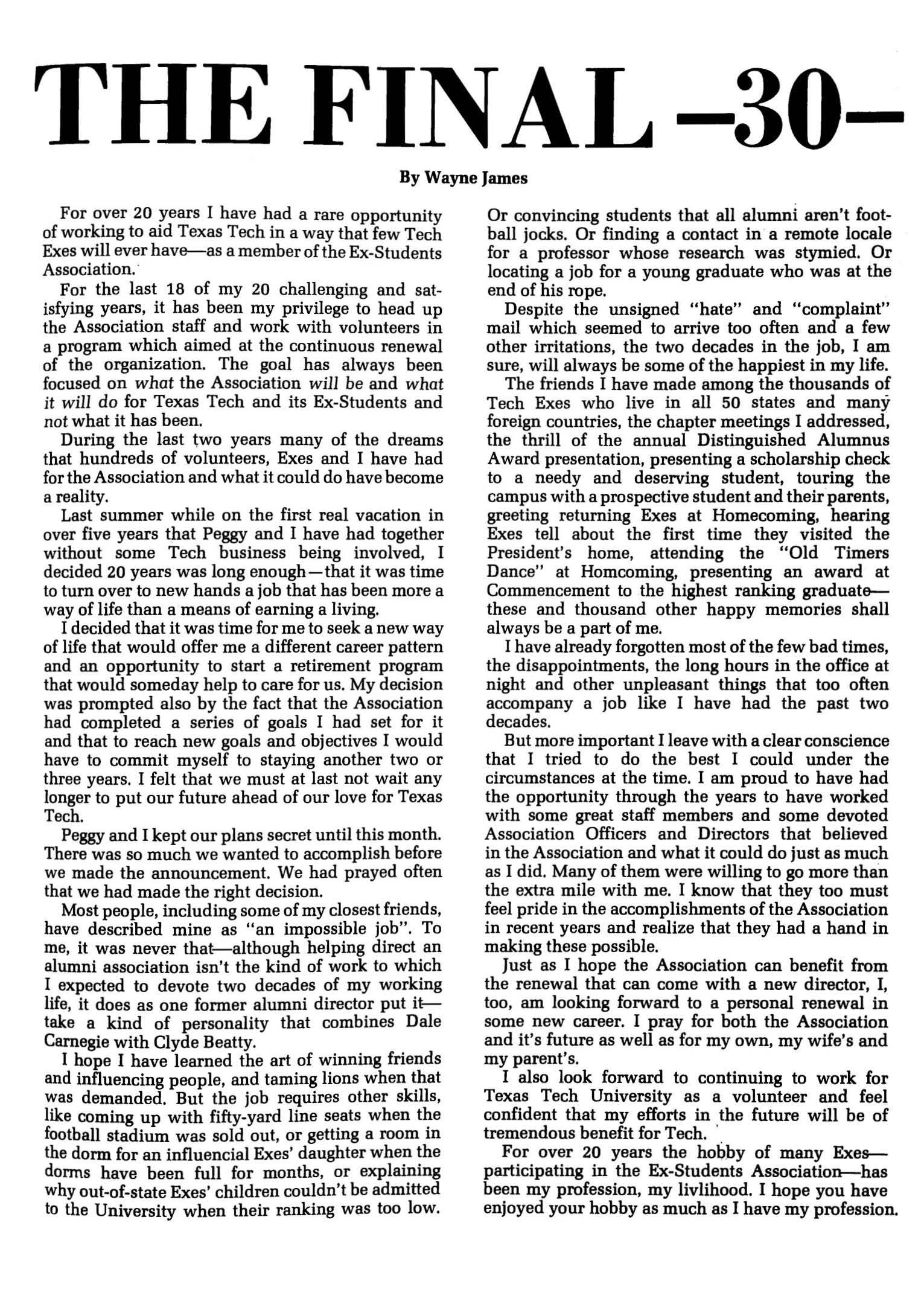 For the last 18 of my 20 challenging and satisfying years, it has been my privilege to head up the Association staff and work with volunteers in a program which aimed at the continuous renewal of the organization The goal has always been focused on what the Association will be and what it will do for Texas Tech and its Ex-Students and not what it has been.