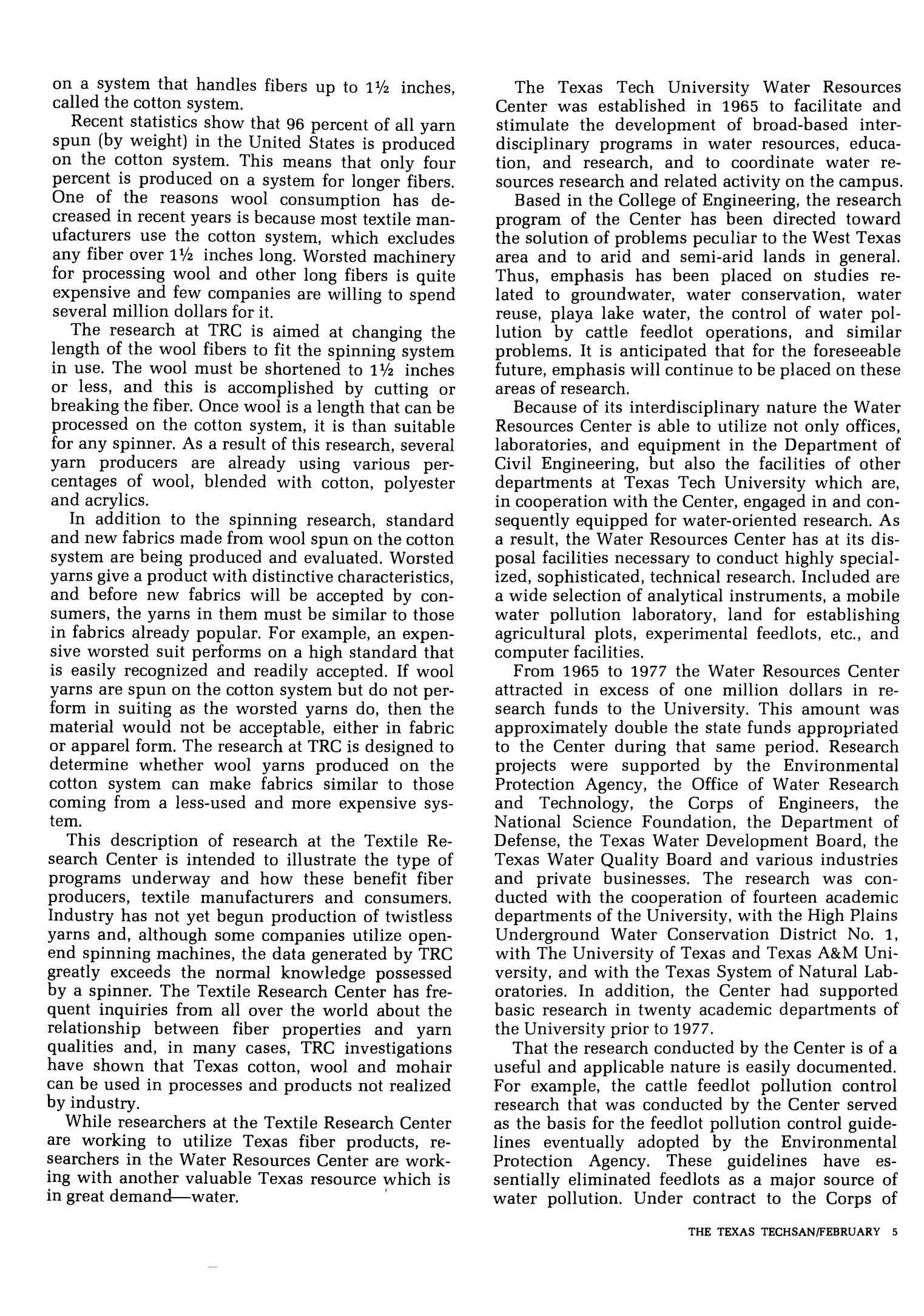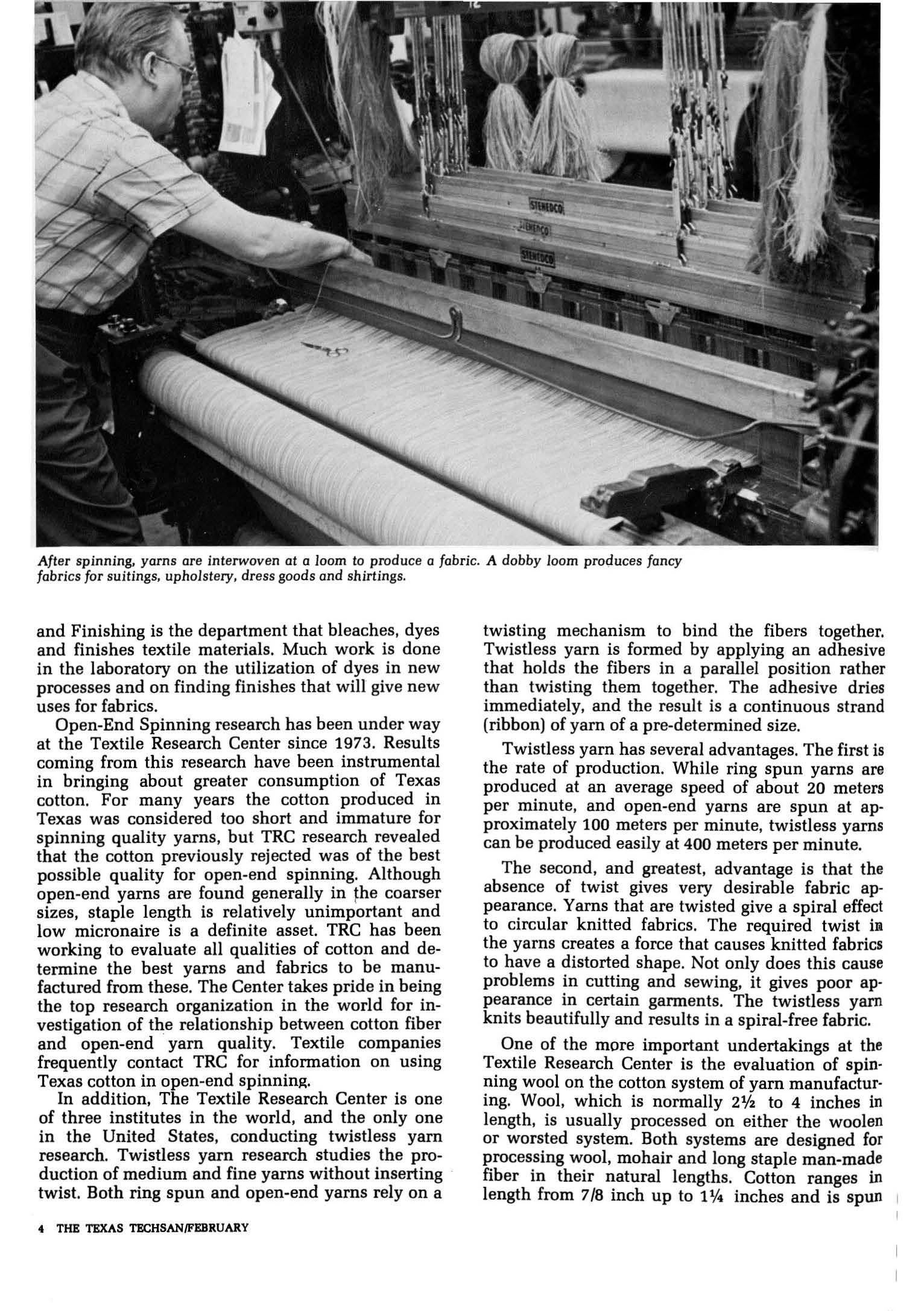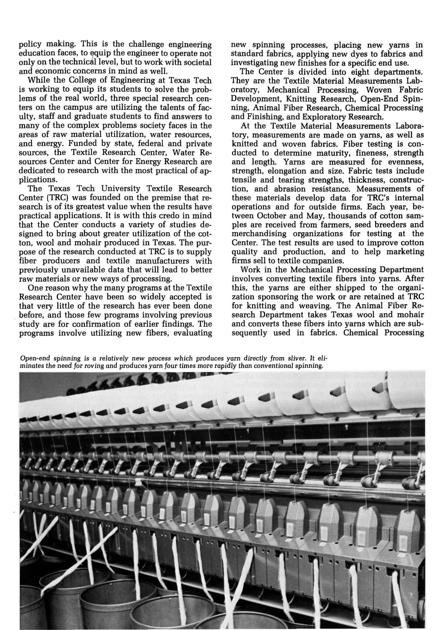 This description of research at the Textile Research Center is intended to illustrate th e type of programs underway and how these benefit fiber producers, textile manufacturers and consumers. Industry has not yet begun production of twistless yarns and, although some companies utilize openend spinning machines, the data generated by TRC greatly exceeds the normal knowledge possessed by a spinner. The Textile Research Center has frequent inquiries from all over the world about th e relationship between fiber properties and yarn qualities and, in many cases, TRC investigations have shown that Texas cotton, wool and mohair can be used in processes and products not realized by industry