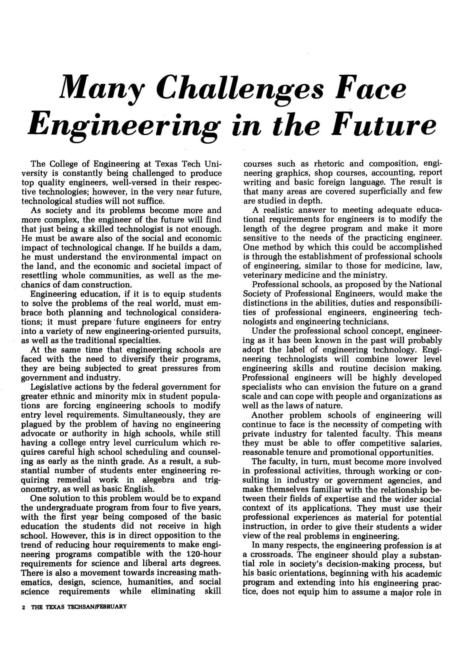 The College of Engineering at Texas Tech University is constantly being challenged to produce top quality engineers, well-versed in their respective technologies; however, in the very near future, technological studies will not suffice.
