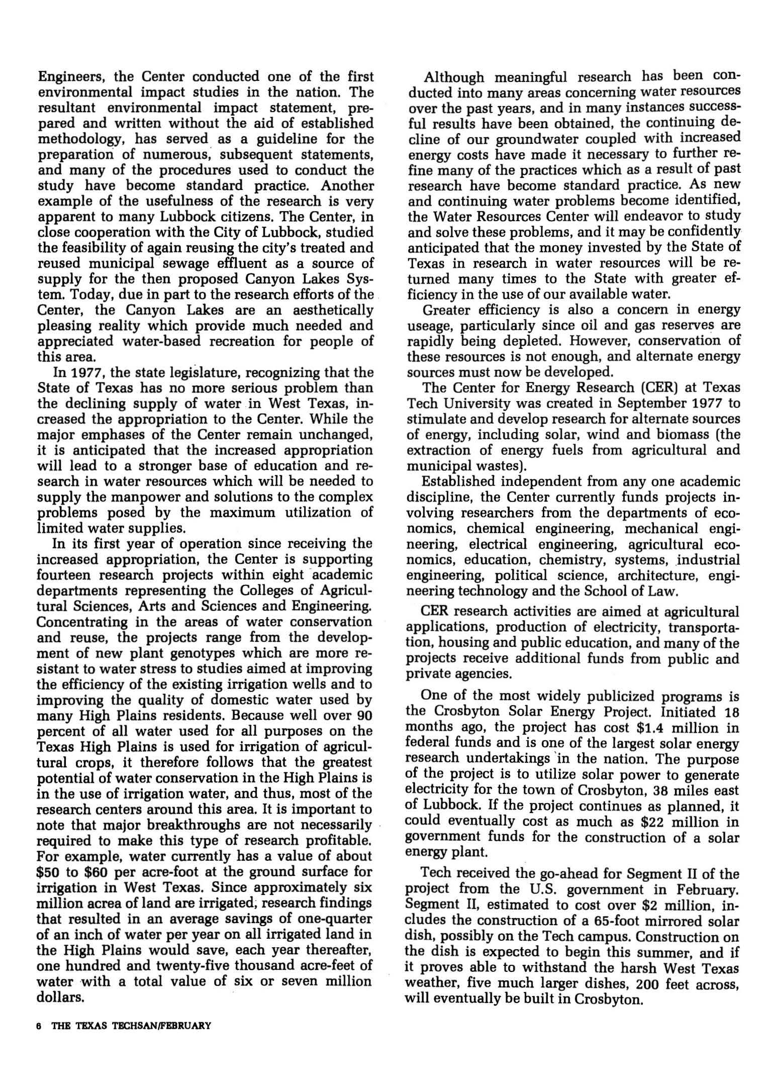 In 1977, the state legislature, recognizing that the State of Texas has no more serious problem than the declining supply of water in West Texas, increased the appropriation to the Center. While the major emphases of the Center remain unchanged, it is anticipated that the increased appropriation will lead to a stronger base of education and research in water resources which will be needed to supply the manpower and solutions to the complex problems posed by the maximum utilization of limited water supplies.