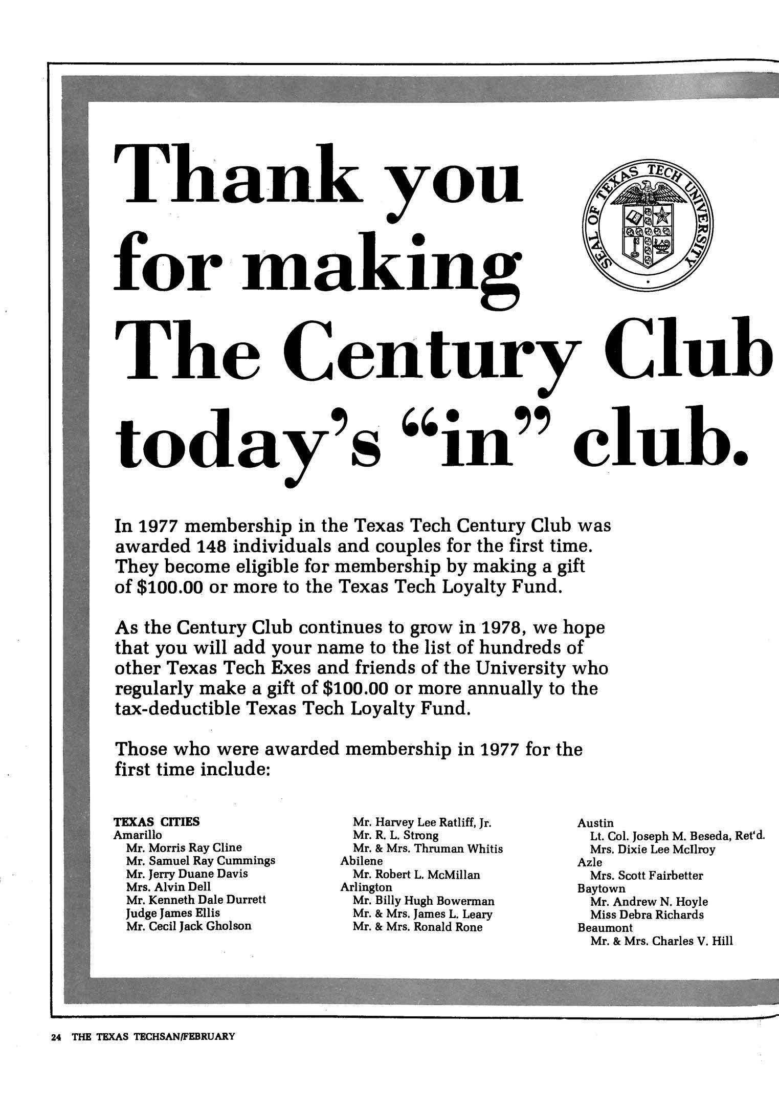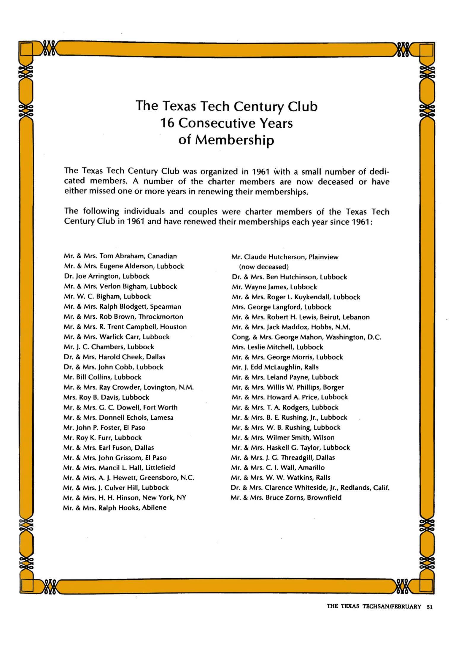 The Texas Tech Century Club was organized in 1961 with a small number of dedicated members. A number of the charter members are now deceased or have eit her m issed one or more years in renewing their memberships