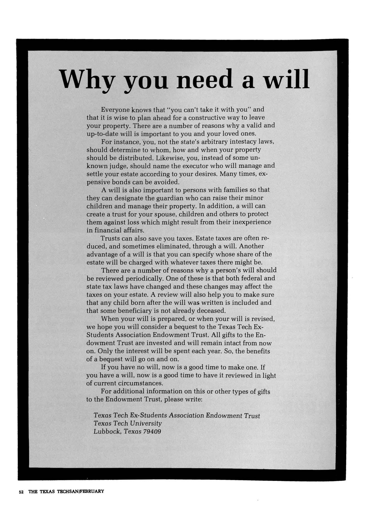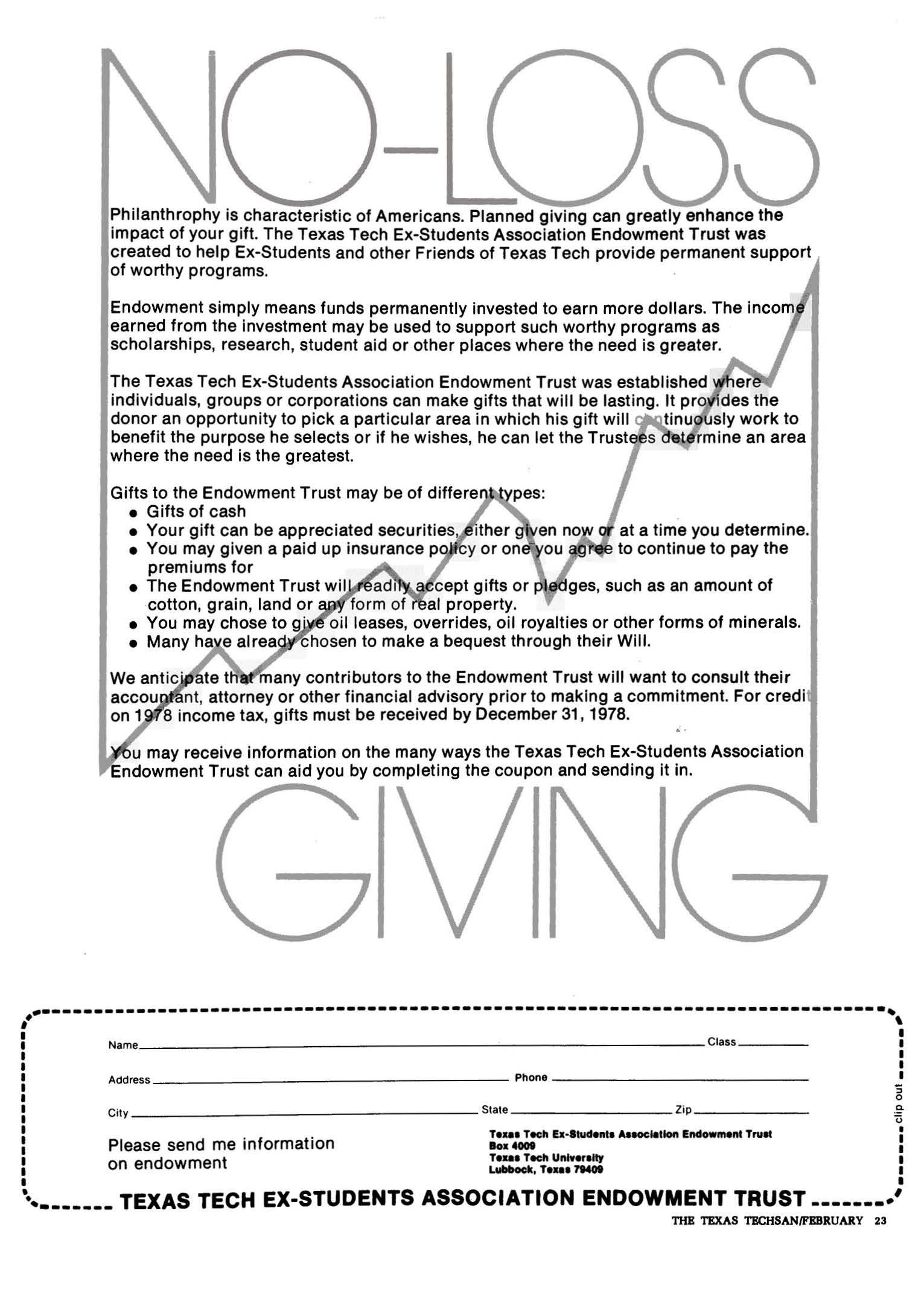When your will is prepared, or when your will is revised, we hope you will consider a bequest to the Texas Tech ExStudents Association Endowment Trust. All gifts to the Endowment Trust are invested and will remain intact from now on. Only the interest will be spent each year. So, the benefits of a bequest will go on and on.
