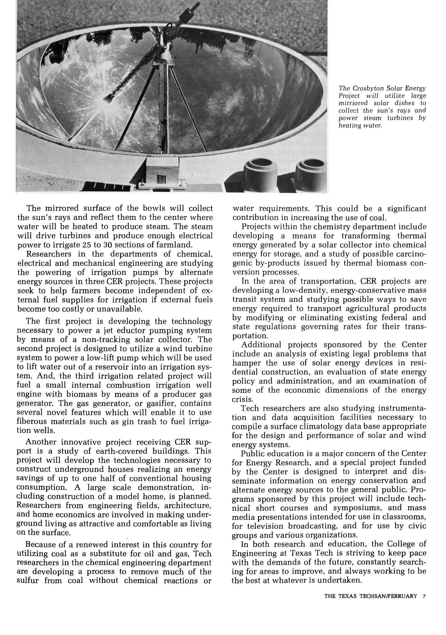 While the College of Engineering at Texas Tech is working to equip its students to solve the problems of the real world, three special research centers on the campus are utilizing the talents of faculty, staff and graduate students to find answers to many of the complex problems society faces in the areas of raw material utilization, water resources, and energy. Funded by state, federal and private sources, the Textile Research Center, Water Resources Center and Center for Energy Research are dedicated to research with the most practical of applications.