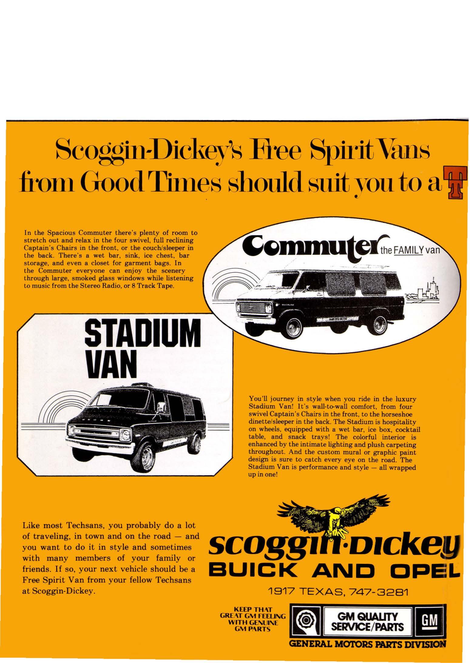 Like most Techsans, you p robably do a lot of traveling, in town and on the road and you wa nt to d o it in style and sometimes with many members of your family or fr iend s. If so, your next vehicle s h ould be a F r ee Spirit Van from your fellow Techsans at Scoggin-Dickey. SCO!fgl ·DICke. BUICK AND OPE L 1 917 T EXAS , 7 4 7- 32 81 GINERAL IIOTORS JIU'I'S