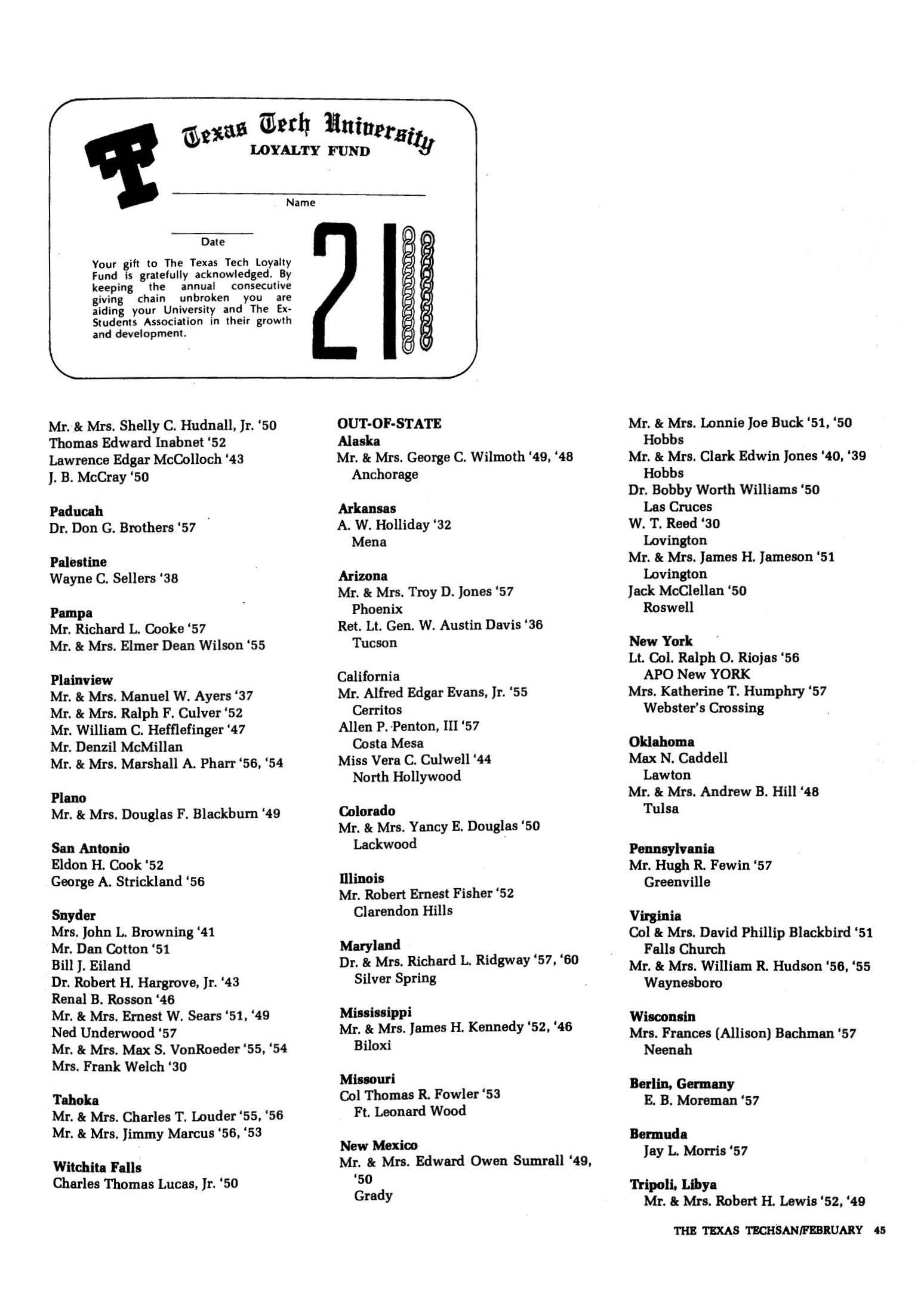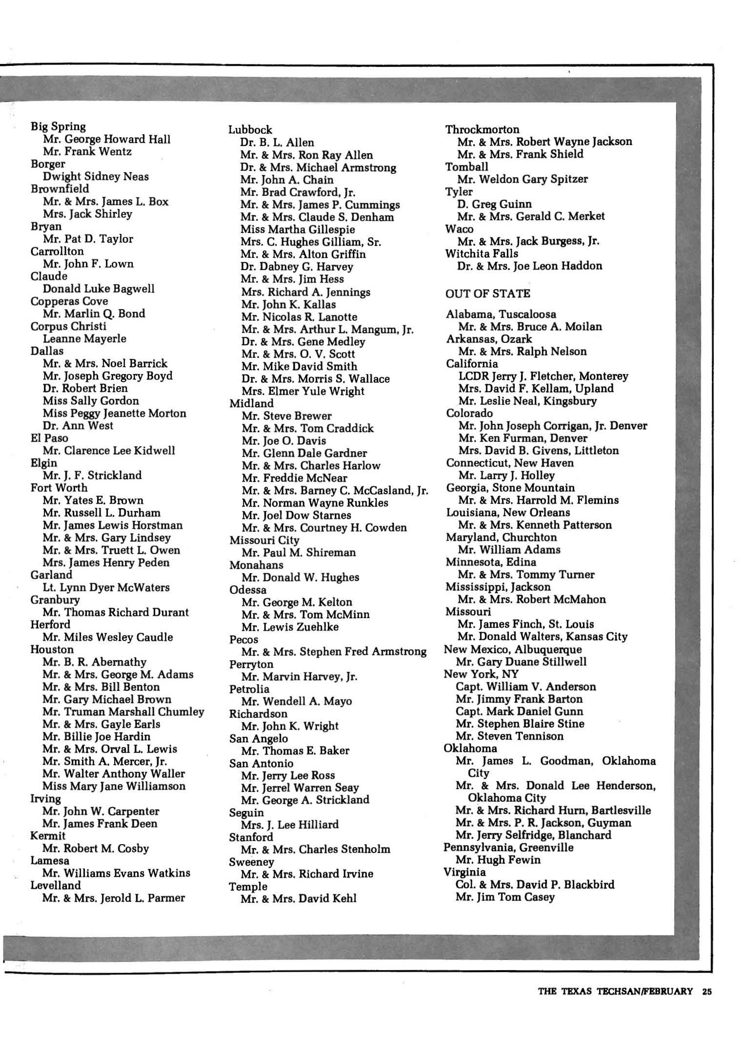 Dr & Mrs. Ben Hutchinson , Lubbock Mr Wayne James, Lubbock Mr & Mrs. Rog e r L. Kuykendall , Lubboc k Mrs. George Langford, Lubbock Mr. & Mrs Robert H Lewis, Beirut, Lebanon Mr. & Mrs Jack Maddox, Hobbs, N M Co ng. & Mrs. George Mahon , Washington , D.C. Mrs Leslie Mitchell , Lubbock Mr & Mrs George Morris, Lubboc k Mr. J. Edd Mclaughlin , Rall s Mr. & Mrs Leland Payne, Lubbo c k Mr. & Mrs Willis W Phill ips, Borger Mr. & Mrs Howard A Price, Lubbo c k Mr. & Mrs T A Rodgers, Lubbock Mr. & Mrs. B. E. Rushing, Jr. , Lubbo ck Mr & Mrs W B Rushing, Lubbock Mr & Mrs Wilmer Smith, Wilson Mr & Mrs Haskell G. Taylor, Lubbock Mr & Mrs. J. G Threadgill, Dallas