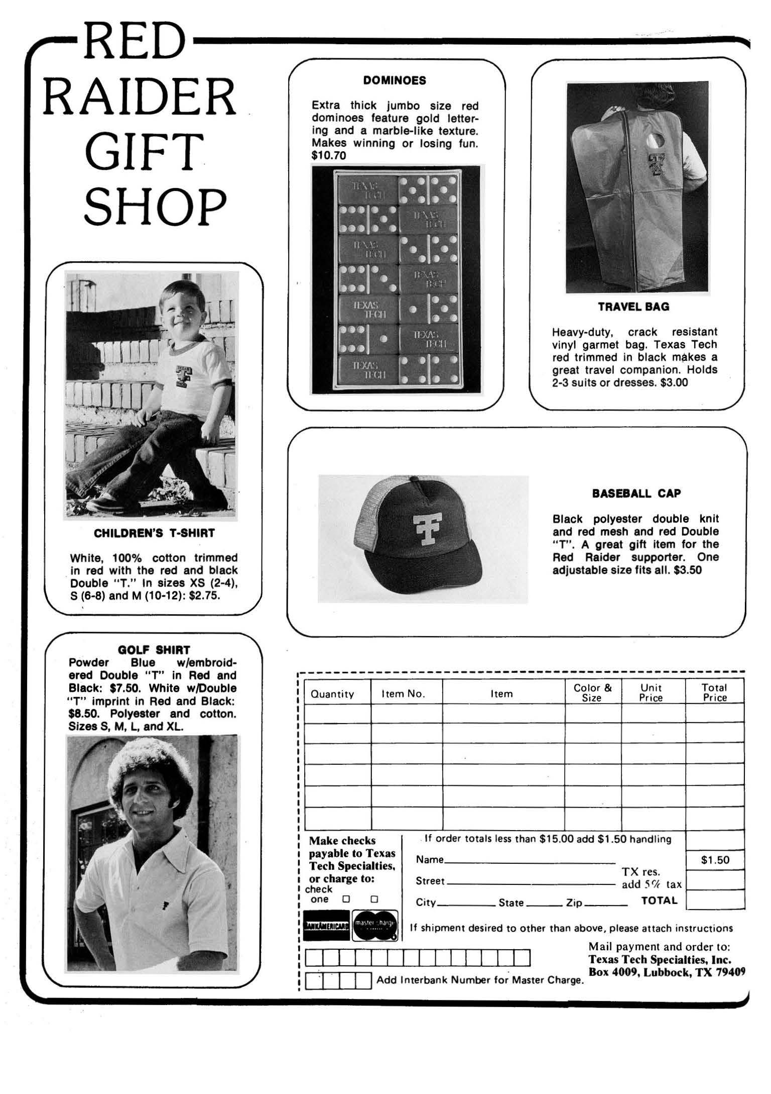 RAIDER GIFT. SHOP CHILDREN'S T·SHIRT White , 100% cotton trimmed In red with the red and black Double "T." In sizes XS (2-4), S (6·8) and M (10 12): $2.75 GOLF SHIRT Powder Blue w/embrold· ered Double "T" in Red and Black: $7 50. White wJDouble " T" imprint i n Red and Black: $8.50 Polyester and cotton Sizes S, M , L, and XL. DOMINOES Extra thick jumbo size red dominoes feature gold lettering and a marble-like texture Makes winning or losing fun $10.70 • • • •• •I •••• ...,.. ...·.l l:'i'.·· I II 'i' ' i. ,..• ,. •• I • • 1:': I IIX/1: ; I 1·••••IICII e c::1 • 1 I II X/\, r: II Lll e II ;'J\:, II 1:11.1 •• • • • Quant it y Item No Item TRAVEL BAG Heavy-duty, crack resistant vinyl garmet bag Texas Tech red trimmed in black makes a great travel companion Holds 2·3 suits or dresses $3.00 BASEBALL CAP Black polyester double knit and red mesh and red Double " T". A great gift item for the Red Raider supporter One adjustable size fits all. $3 50 Color & Unit Total Size Pri ce Price Make checks It o rd e r totals le ss than $15 00 add $1 50 h andl ing payable to Texas Name $1 50Tech Specialties, TX res or charge to: Street a dd s rlr ta xcheck one 0 0 City State _ Zip TOTAL •• If shipment desired to ot her than above please a ttach ins tructions I I I I I I I I I I I ': ,... 1 -.1 Mail pay ment an d order to : . . _ I I I I I Texas Tech Specialties, Inc 1 1 , 1 · 1 1 · Box 4009, Lubbock, TX 79409 _ _ Add Interban k Number for Master Charge