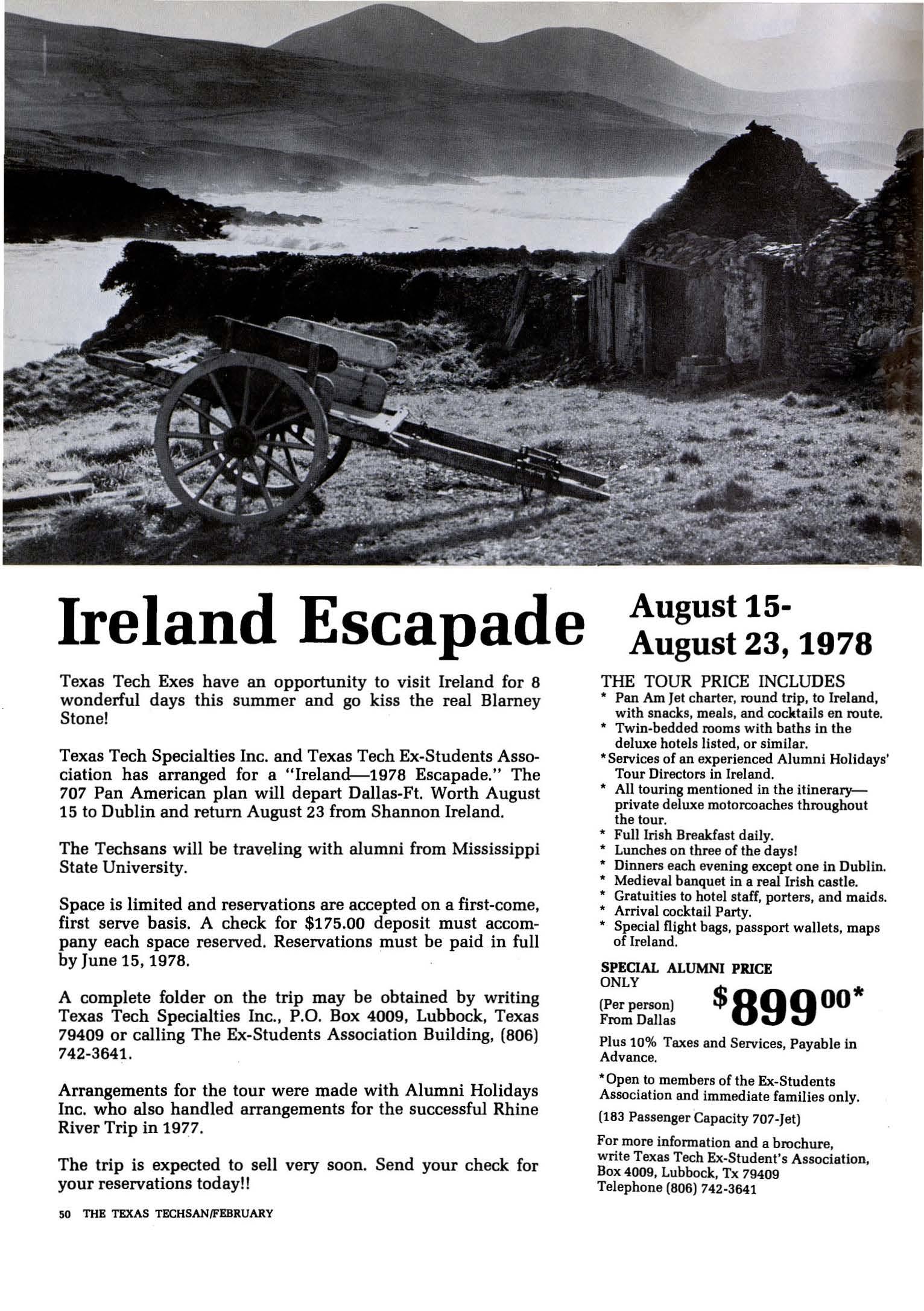 A complete folder on the trip may be obtained by writing Texas Tech Specialties Inc., P.O . Box 4009 , Lubbock, Texas 79409 or calling The Ex-Students Association Building, (806) 742-3641