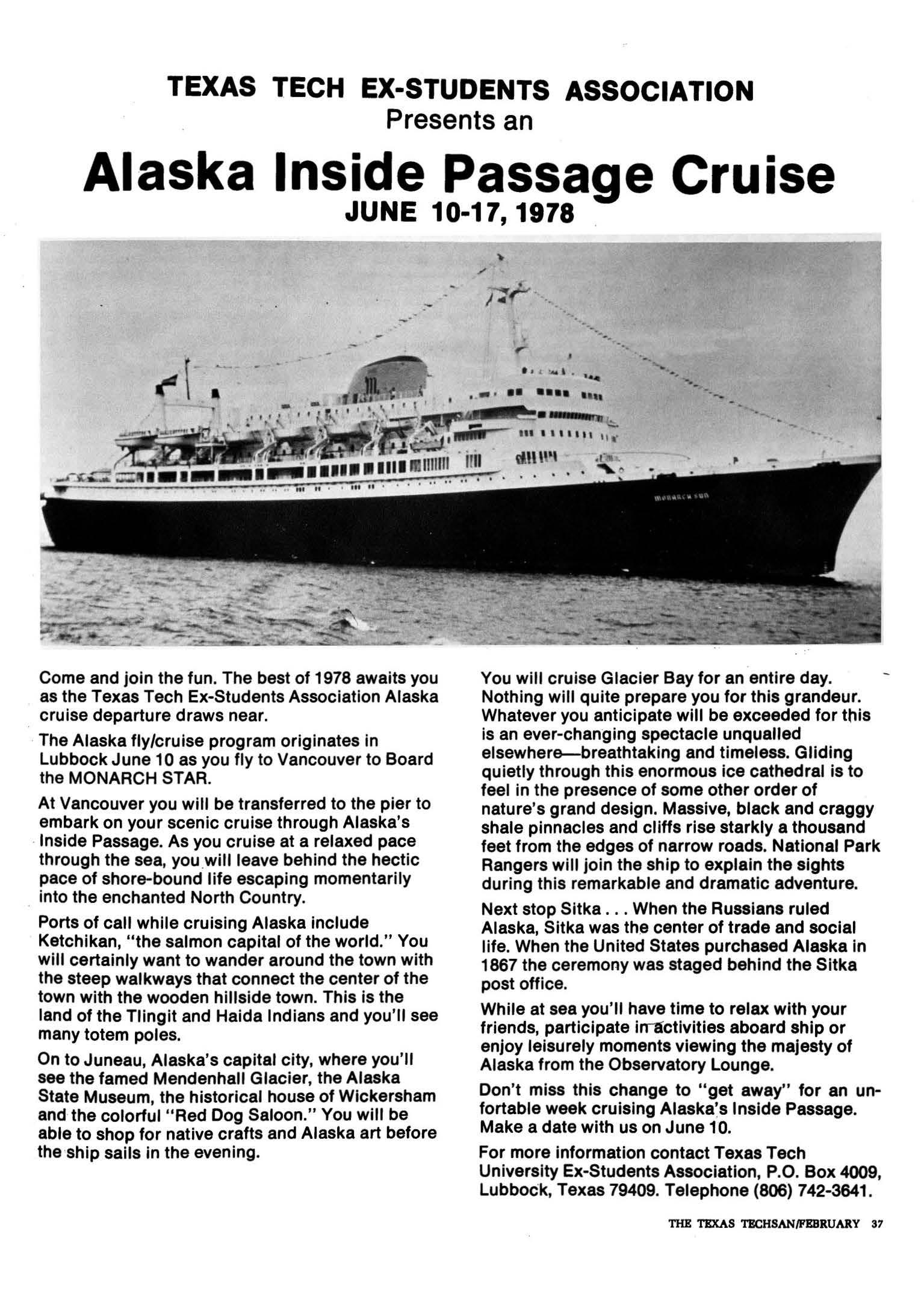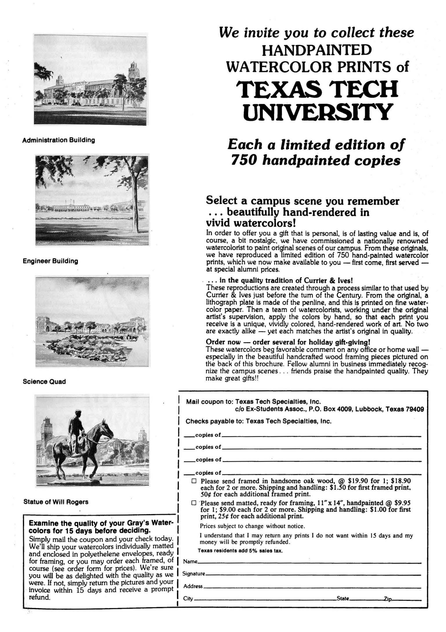 For more information and a brochure, write Texas Tech Ex-Student's Association, Box 4009, Lubbock, Tx 79409 Telephone (806) 742-3641