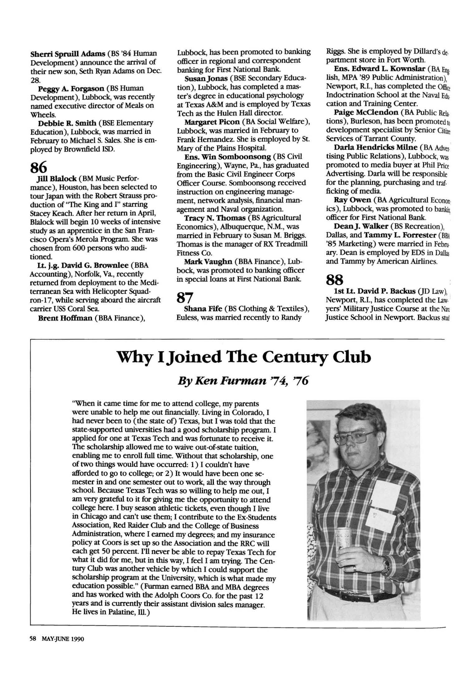 Working on this issue of The Texas Techsan has been a real pleasure for me. The feature stories, plus several of the smaller articles, were written by Texas Tech students. Their sources for interviews, in nearly every case, are University professors - experts in their own areas and current with the statistics and trends that affect their subjects. The students chose their own topics to fit into a theme called '7be Changing of America's Values." The stories they researched, interviewed for and wrote outline many of the changes in the society that has been shaped by them, by the Baby Boomers and by the older Americans who make up a larger and larger segment of that society. As jar as I have been able to learn, this is a first for an alumni magazine to feature aU student writers. I'm proud of the subjects they have tackled, and that my boss, Dr. BiU Dean, backed me on this idea. Thanks, too, to Dr. jerry Hudson, director of the School of Mass Comm, for his support of me while teaching in the journalism program. Students need to get their work published while stiU in school, and The Texas Techsan is very pleased to offer them our pubUcation for that opportunity. I'm sure you wiU enjoy reading each of the articles as much as I have enjoyed working with the students and editing their work for this issue.