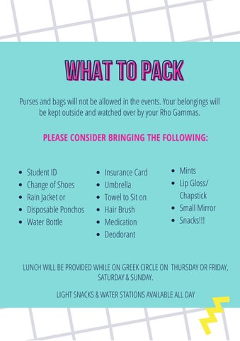 Purses and bags will not be allowed in the events. Your belongings will be kept outside and watched over by your Rho Gammas.