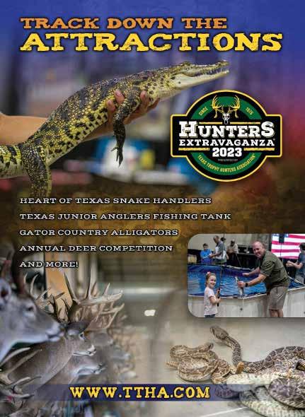 accompanied by a self-addressed stamped envelope or return postage, and the publisher assumes no responsibility for loss or damage to unsolicited materials. Any material accepted is subject to revision as is necessary in our sole discretion to meet the requirements of our publication. The act of mailing a manuscript and/or material shall constitute an express warranty by the contributor that the material is original and in no way an infringement upon the rights of others. Photographs can either be RAW, TIFF, or JPEG formats, and should be high resolution and at least 300 dpi. All photographs submitted for publication in “Hunt’s End” become the sole property of the Texas Trophy Hunters Association Ltd. Moving? Please send notice of address change (new and old address) 6 weeks in advance to Texas Trophy Hunters Association, P.O. Box 3000, Big Sandy, TX 75755-9918. POSTMASTER: Please send change of address to The Journal of the Texas Trophy Hunters, Texas Trophy Hunters Association, P.O. Box 3000, Big Sandy, TX 75755-9918.