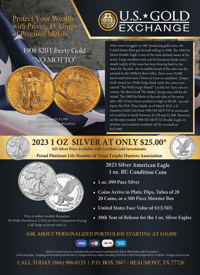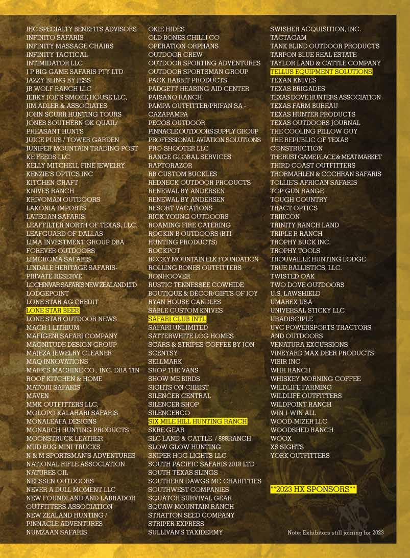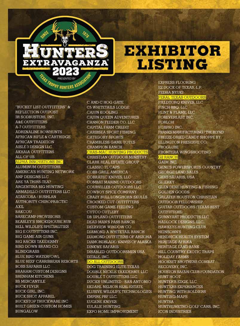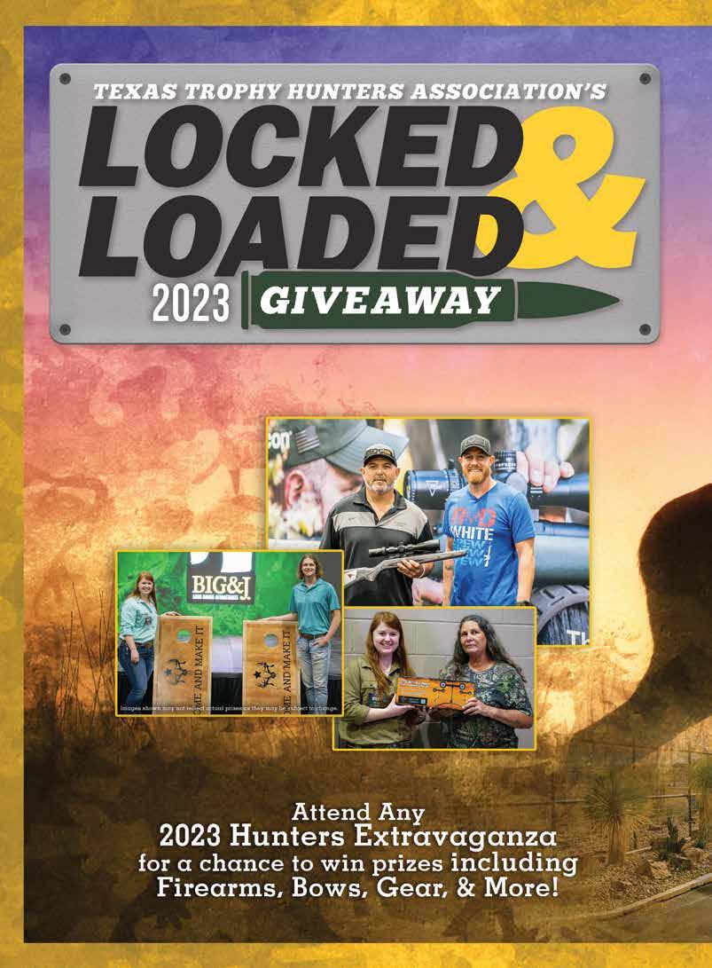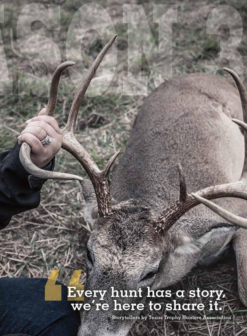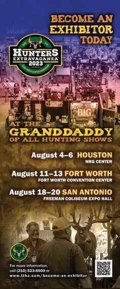 accompanied by a self-addressed stamped envelope or return postage, and the publisher assumes no responsibility for loss or damage to unsolicited materials. Any material accepted is subject to revision as is necessary in our sole discretion to meet the requirements of our publication. The act of mailing a manuscript and/or material shall constitute an express warranty by the contributor that the material is original and in no way an infringement upon the rights of others. Photographs can either be RAW, TIFF, or JPEG formats, and should be high resolution and at least 300 dpi. All photographs submitted for publication in “Hunt’s End” become the sole property of the Texas Trophy Hunters Association Ltd. Moving? Please send notice of address change (new and old address) 6 weeks in advance to Texas Trophy Hunters Association, P.O. Box 3000, Big Sandy, TX 75755-9918. POSTMASTER: Please send change of address to The Journal of the Texas Trophy Hunters, Texas Trophy Hunters Association, P.O. Box 3000, Big Sandy, TX 75755-9918.
