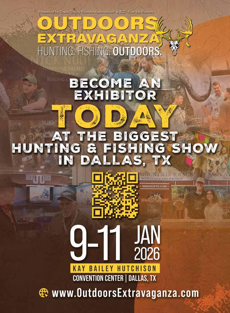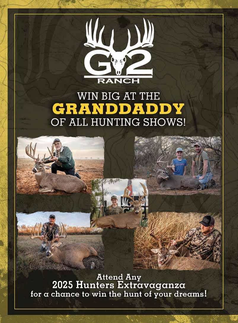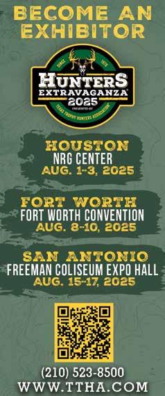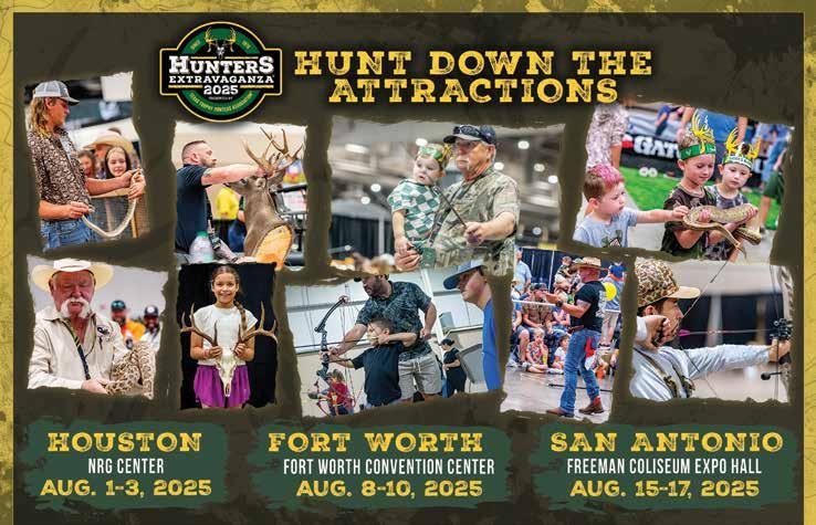 Kick-off your 2025 hunting season(s) with us at the Hunters Extravaganzas in Houston, Fort Worth and San Antonio. Discover the latest and greatest in camo, blinds, feeders, ATV’s, optics and so much more. Enjoy a seminar from hunting/outdoor experts, or even book your dream hunt. Bring the family; bring your friends. There’s plenty of fun for the kids, too. You won’t want to miss it! More details starting on page 32.