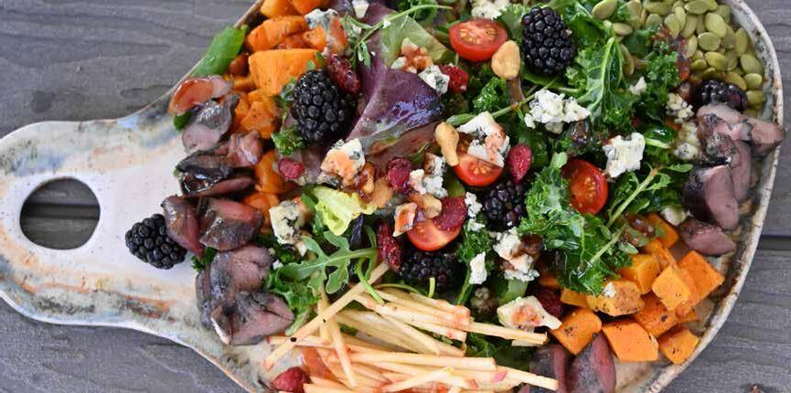 A composed salad is built intentionally and attractively using four components – a base, body, garnish and dressing. The base of this summer salad is composed of baby red, butter lettuce, kale and arugula. Its body, comprised of dove breast and butternut squash, creates a main layer for garnishes of Honeycrisp apple, blackberries, walnuts, tomatoes, cranberries and tangy gorgonzola cheese. Lastly, the strawberry vinaigrette is spooned over just before serving to create the perfect bite.