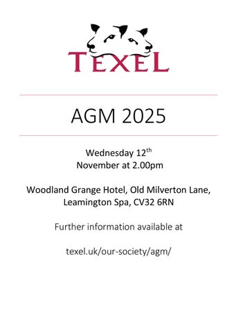 Notice is hereby given that the 2022 Annual General Meeting of the British Texel Sheep Society Limited will be held in The Argyll Suite, Drimsynie Estate Leisure Centre, Drimsynie, Lochgoilhead, Cairndow PA24 8AD, at 16.30 on Saturday November 12th 2022 for the following purposes. 1. To Receive apologies for absence 2. RESOLUTION: Approval of the minutes and matters arising from the 2021 AGM which took place on 11th November 2021 at Woodland Grange, Leamington Spa. 3. To receive the Chairman’s report 4. To receive the Chief Executives report 5. RESOLUTION: To receive, consider and adopt the income and expenditure account for the year ended 31 March 2022 and the balance sheet as at that date and to receive, consider and adopt the reports of the Board of Directors and the Auditors for the year ended 31 March 2022. 7. RESOLUTION: To confirm the appointment of Daffern’s LLP as the Auditors for the Society and to authorise the Board of Directors to fix their remuneration. 8. Announcement of Board of Directors election results Area 8 Southern Midlands of England – Peter Mitchell – unopposed Area 9 South West of England – Angus Howie – unopposed Area 11 South Wales & Borders – No nominations received – post vacant Area 12 Northern Ireland – Alastair Gault – unopposed 9. Any other business that has been approved by the Chairman for discussion. By order of the board John Yates MBA Chief Executive & Company Secretary – 26th July 2022 The Mechanics Workshop, New Lanark, Lanark, ML11 9DB Friday 11th November – Sunday 13th November at Drimsynie Estate Holiday Village, Lochgoilhead, PA24 8AD More information at texel.uk/agm#addtexeladdvalue