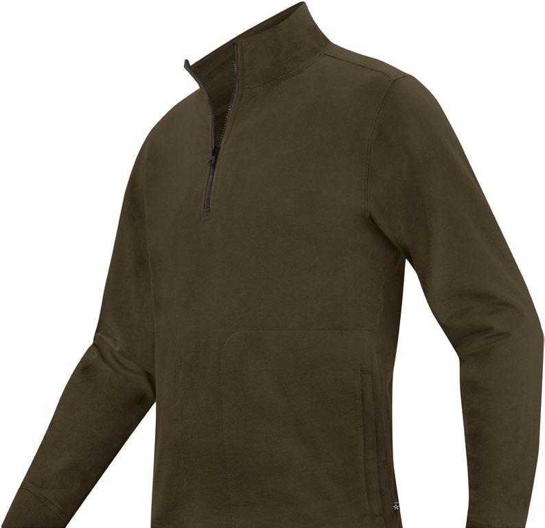 Stylish Nato pullover with zip and high collar. Ribbed cuffs and lower edge. Chest pocket with flap, pen compartment on left sleeve. Reinforced shoulders and elbows.