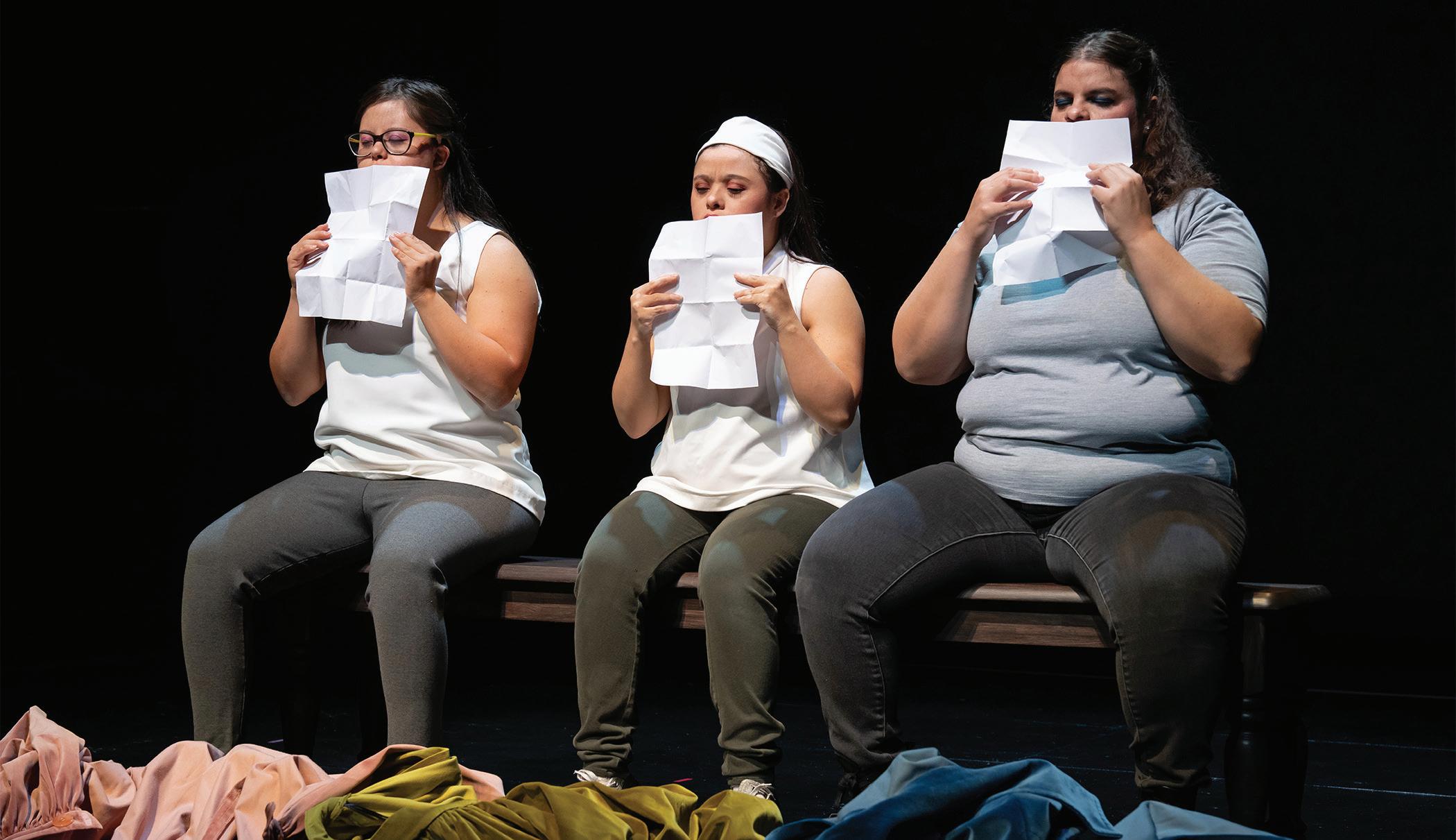 The concept of autonomy is explored further with the three Ophelias reading letters that raise questions related to their own bodies, their womanhood and desires of motherhood which are all taboo topics when it comes to women with down syndrome. Can they have a child? How are they going to support them, educate them? The questions are also posed to the audience by the three performers. For Cristina, this is “the dream of the three women, because Ximena talks about independence, Diana talks about wanting to be a mother, and I talk about wanting to find love, and they all come together, which I find very entertaining.”