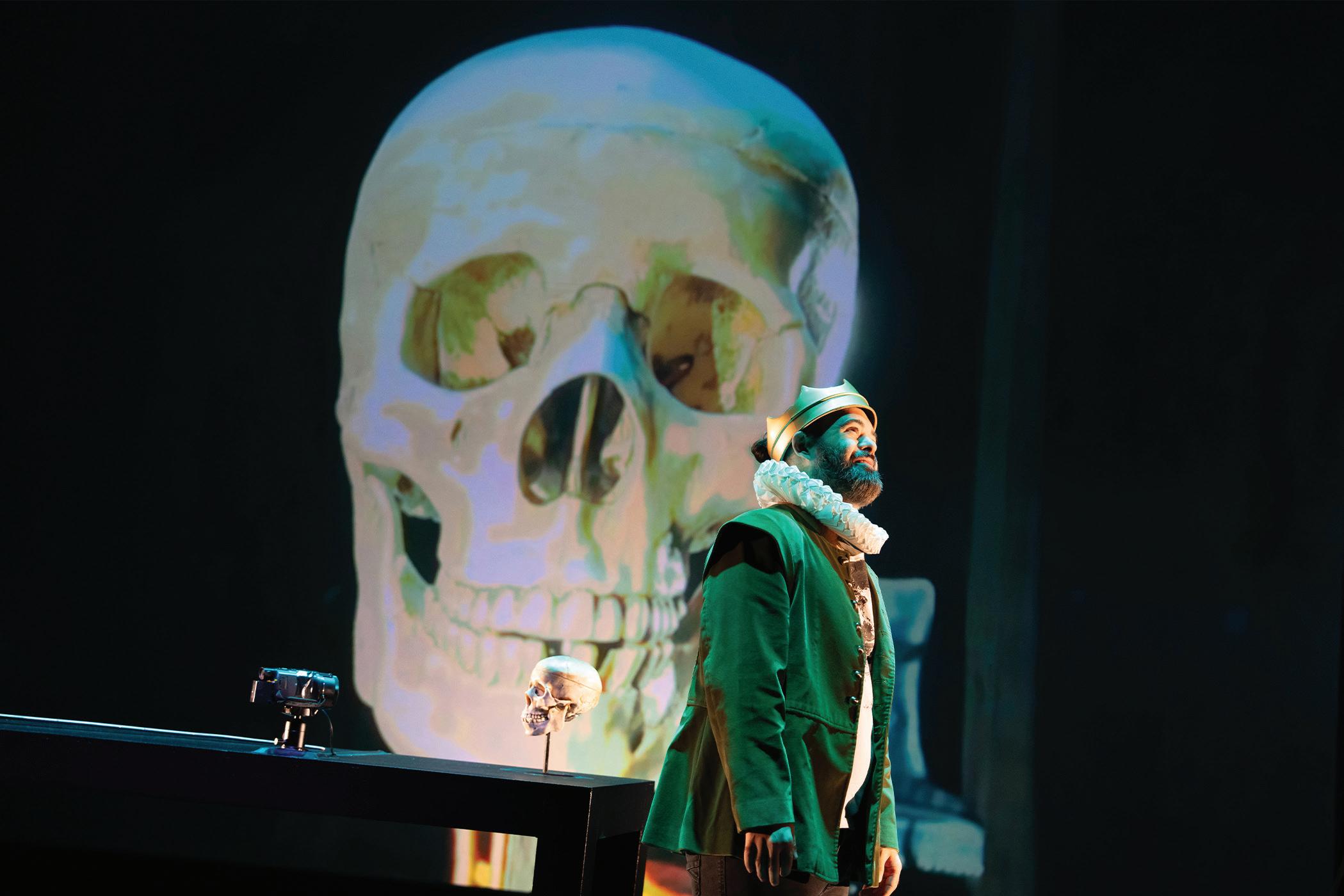 But Hamlet’s famous question can also be translated in Spanish as “Estar o no estar.” Estar expresses a more transitional and situated being space and time: one that requires physical presence. To be on stage is to be visible, to be empowered and ultimately to belong in that place. This sense of belonging and doubt is most powerful when Jaime Cruz, one of the actors playing Hamlet, stands in front of images and videos of previous performers who have embodied the character, from Laurence Olivier to Kenneth Branagh, from Benedict Cumberbatch to Papa Essiedu. The scene follows with a recorded phone call conversation with Sir Ian McKellen where Cruz enquires how he should approach the role. In response, all the other actors dissuade Hamlet/Jaime from trying to copy Olivier’s or any other actor who has played the part before and instead, to find his own way, from the truth of his lived experience.