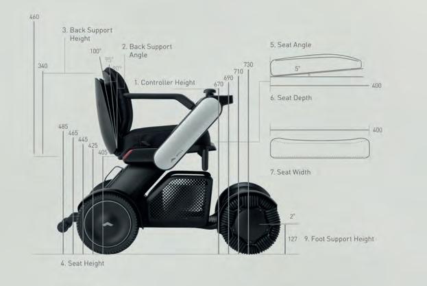WHILL FWHILL C2MinimoMinimo Plus Minimo Autofold MaximoMaximo Plus Zest Zest Plus Zest S Length (box removed) 93.5cm98cm96cm96cm96cm122cm122cm106cm114cm114cm Width 60.5cm55cm54cm54cm54cm64cm64cm55cm57cm60cm Folded Dimensions ––45x84x54cm45x84x54cm47x84x54cm54x106x-54x106x-–––Height - Tiller down 90cm73-94cm82cm87cm86cm96cm113cm87cm91cm96cm Height - Seat removed & tiller down –44-49cm–87cm86cm96cm113cm87cm89cm89cm Seat Width 45cm40,45or40cm40cm40cm45cm45cm47cm47cm47cm Total Weight 26.7kg52.5kg28kg30kg32kg42kg47kg50kg74kg79kg Wheel & Tyre Size - Front 19cm26cm17cm17cm17cm24cm24cm20cm23cm23cm Wheel & Tyre Size - Rear 20cm26cm19cm23cm23cm28cm28cm20cm23cm23cm Battery - Standard (*Lith Polymer) 25.3v25.3v24v10.05ah*24v10.05ah*24v10.05ah*24v13.4ah*24v13.4ah*2x12v12ah2x12v33ah12v33ah Battery - LongRange (*Lith Polymer) ––24v13.4ah*24v13.4ah*–––2x12v22ah––Motor 2x24v150w2x24v150w4-Pole270w4-Pole270w4-Pole270w4-Pole270w4-Pole270w24v270w24v420w24v350w Controller ––S-Drive45aS-Drive70aDynamic50aS-Drive70aS-Drive70aDynamic50aDynamic90aDynamic90a Charger - Standard battery 2.4ah2.4ah24v2.5ah24v2.5ah24v2.5ah24v2.5ah24v2.5ah24v3.5ah24v3.5ah24v3.5ah Max Speed - Variable - up to 6kph6kph6kph6kph6kph6kph10kph6kph6kph6kph Range (up to) Standard 19km16km16km16km16km19km19km16km32km32km Range (up to) Long Range ––19km19km–––26km––Max Weight Limit 115kg136kg115kg115kg115kg133kg133kg135kg160kg168kg Ground Clearance 3.5cm6cm6cm7cm6cm6cm6cm8cm10cm10cm Vehicle Class 2222223222