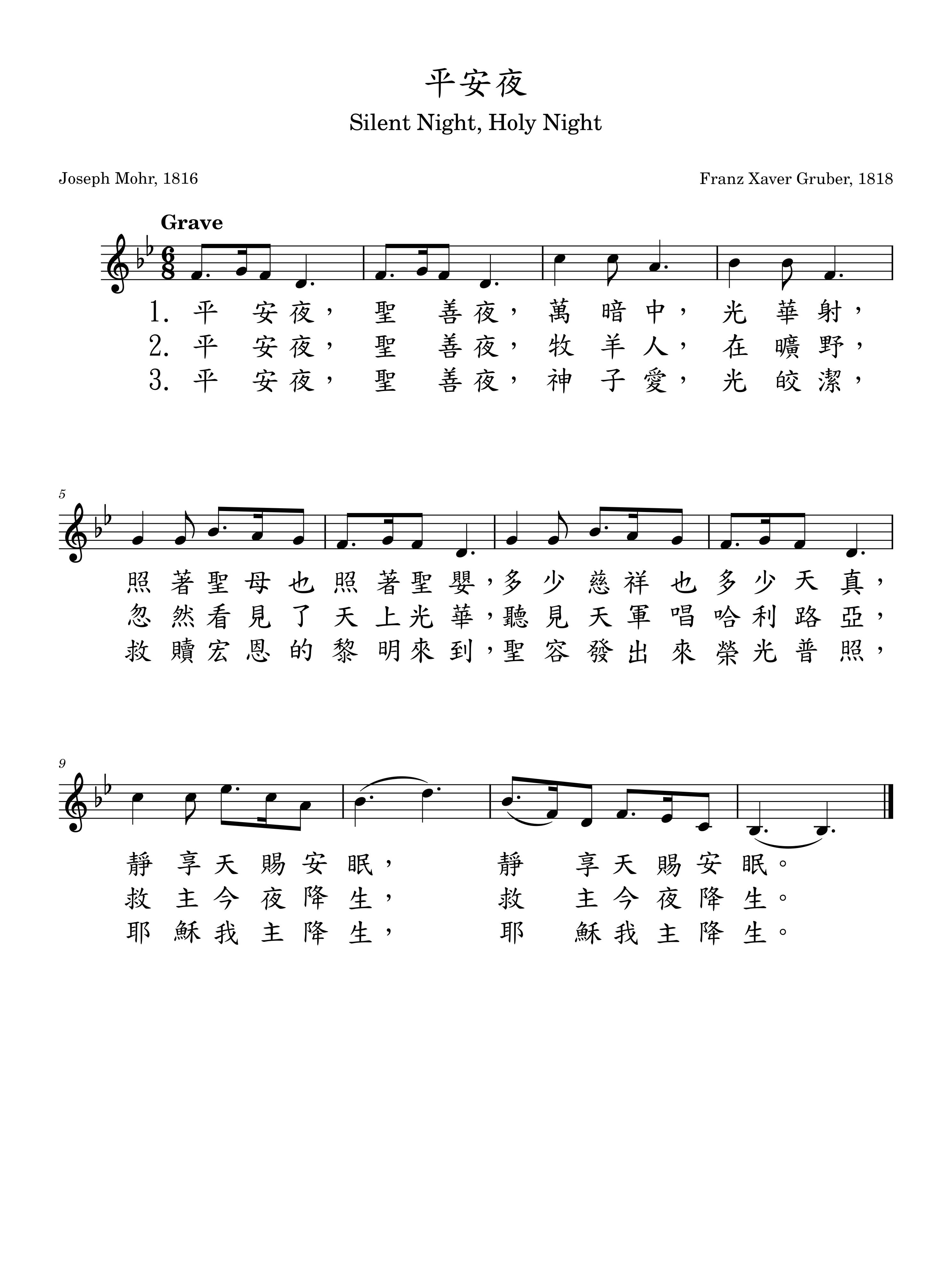 耳邊響起《平安夜》的旋律:「 平安 夜,聖善夜,神子愛,光皎潔,救贖宏恩的 黎明來到,聖容發出來榮光普照,耶穌我主 降生,耶穌我主降生!」