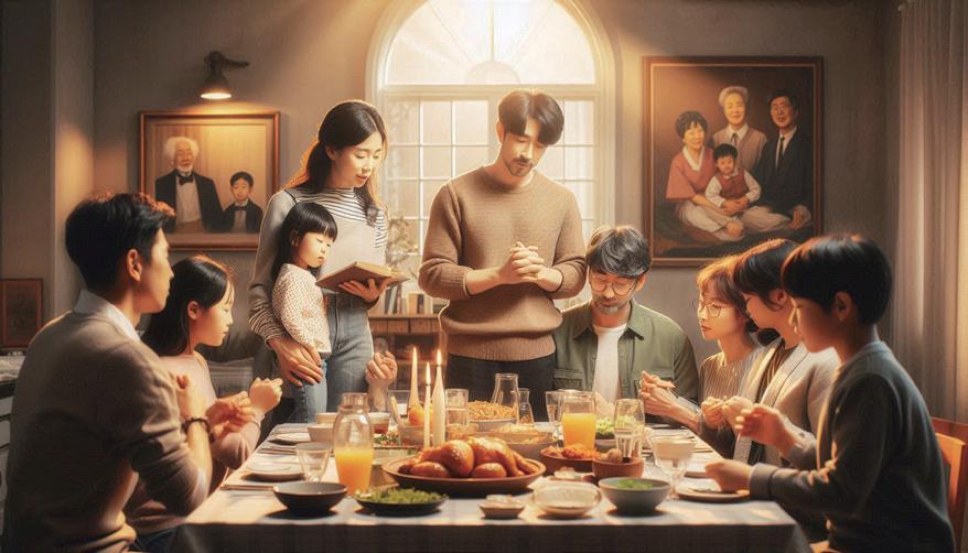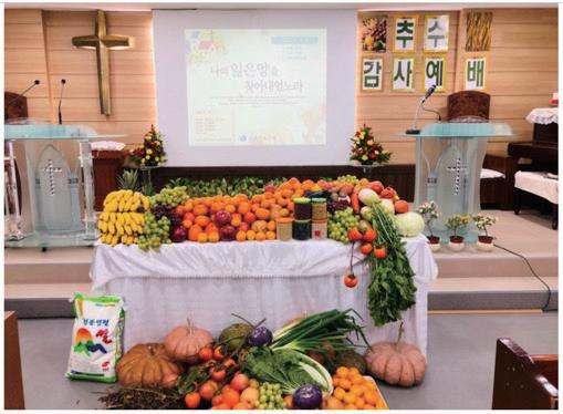 由於韓國屬北方氣候,韓國感 恩節是秋天豐收時期舉行的感恩 儀式。在我參與的教會裡,大家 都會帶著最容易取得也最豐富的 水果,例如:蘋果、梨子等,來 到教會與會眾分享。我們也會帶 米分給有需要的鄰居。正因為如 此,感恩節那天教堂裡充滿了稻 田裡的農作物。如此,感恩節是 每個人享受神豐盛恩典,懷著感 恩之心敬拜的日子。