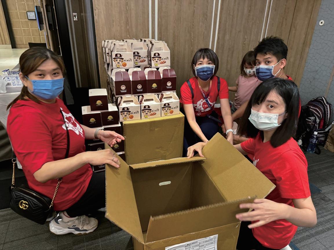 ↓純紋(右)與仟竹一家(後方),第一次參與福隆服事,雖 未能參與行前訓練,現場都能立即加入整理餐盒服事。
