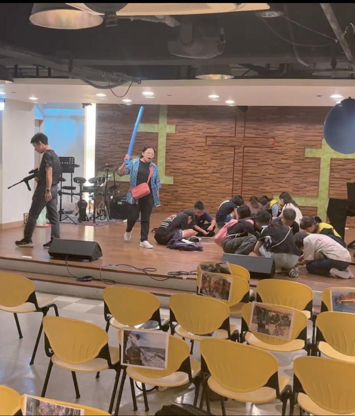 ↓ 每一天面對一群真摯的孩童,我們努力調整教學 內容,漸發現,學童對戲劇演出最感興趣︕ 我們參加主日聚會,恰逢佳音堂慶祝建堂99年。