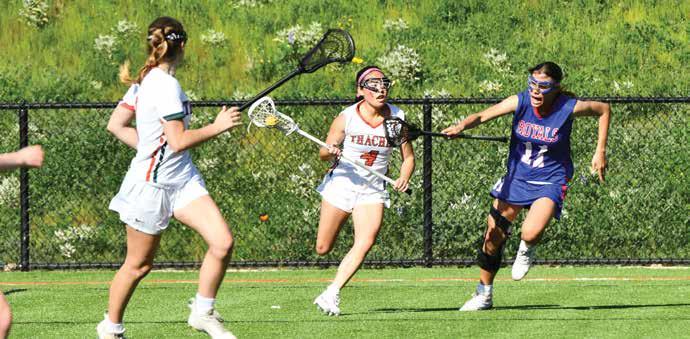 A last-minute goal by senior Julia James against Dos Pueblos at home squeaked Thacher’s girls’ lacrosse team into their first playoff appearance in five years. It also served as a major catalyst for camaraderie and good cheer around campus for the team, a group celebrating many important milestones this year. Head Coach Anne Gregory CdeP 2015 credits the leadership of seniors Brianna Bell, Maria Galgon, Lexie Goodyear, Julia James, Francesca Pelosi, Evelyn Stoen, and Margaret Zhang for helping shape juniors Maddie Lee, Linn Wallmark, Caiden Bang, and Sophia Brant as they rise up to take their spots next year. Notable milestones include Goodyear’s 100th career goal and topping the Channel League scoring stats with 63 goals this season. Additionally Lee dominated the midfield with 43 ground ball pickups, and 13 goals on the season.