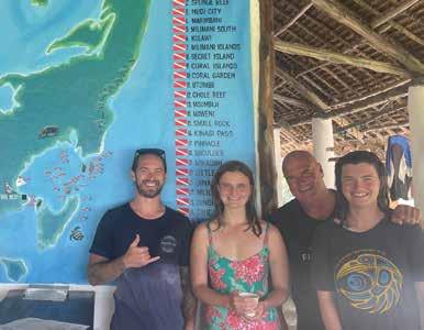 1985 JOHN STACEY shares, “We were literally halfway around the world, on the speck that is Mafia Island in the Indian Ocean off the coast of Tanzania, scuba diving during the last few days of 2023, when we met almost the only other American, CLINTON HENDERSON 2008 He is teaching in the Democratic Republic of the Congo, doing backflips and making music. Three generations of Toad Divers.” Picture from left to right - CLINTON HENDERSON 2008, HOLLAND STACEY 2021, JOHN STACEY and PIPER STACEY 2019