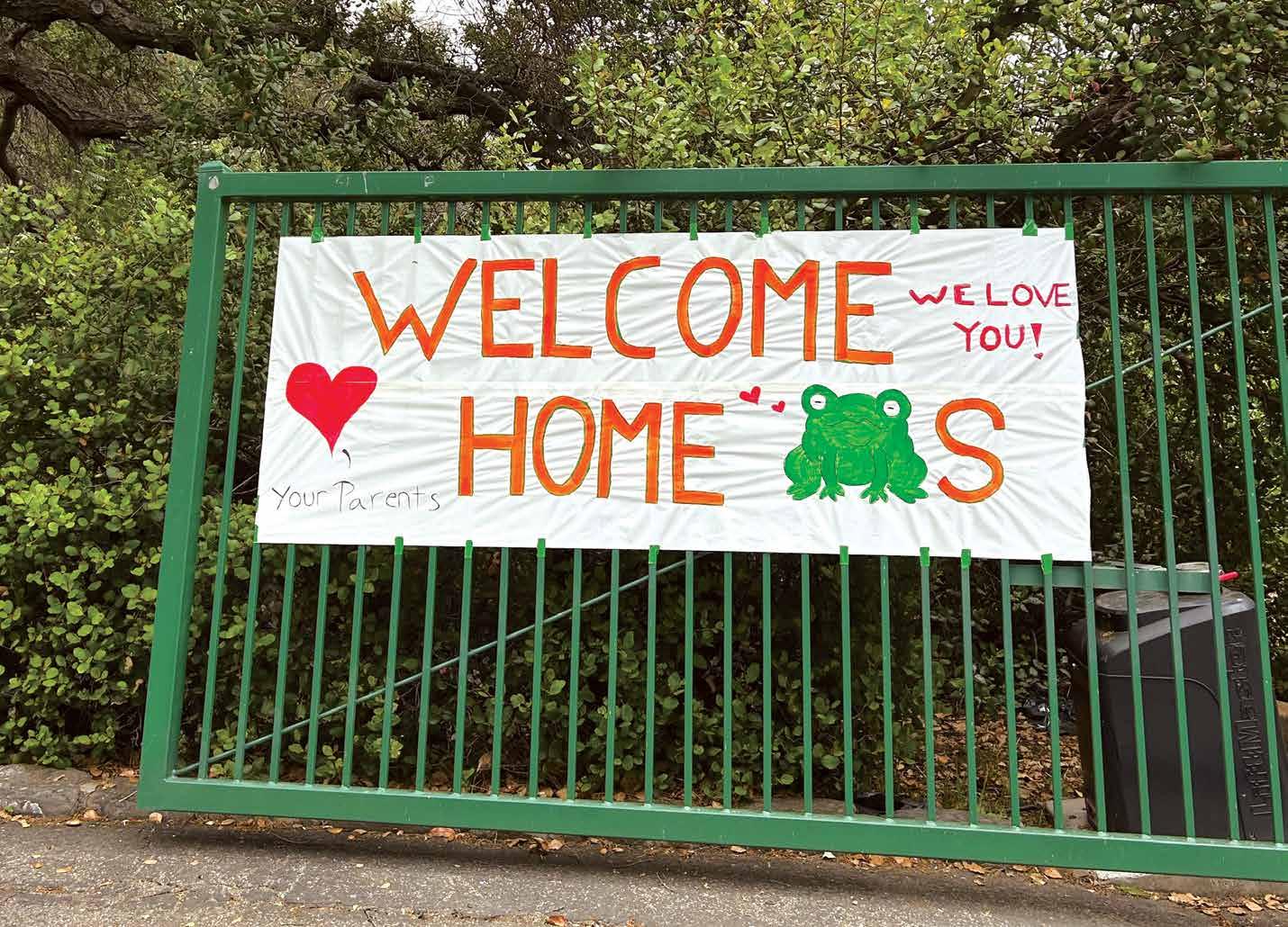 A welcome home banner made by current parents greets students and faculty home from spring EDTs.