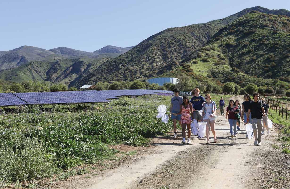 Advanced Bio students conduct a bee survey by the School's solar array, where an extensive hydroseeding project took place last November, helping to establish California native pollinator plants to increase habitats for monarch butterflies and other insects.