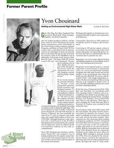 Any one of these monikers could be—and has been—used for Yvon Chouinard, the worldfamous mountaineer, owner and founder of the trend-setting outdoor apparel company Patagonia, and father of Claire, CdeP ’98. Few conjure such a contradictory list of character traits in one individual, let alone one who has been so successful. His success may stem from his extensive study of Zen Buddhism and its philosophy of focusing on the process rather than the result. “You don’t climb Mt. Everest to get to the top,” says Chouinard, “because there’s nothing to do up there. Rather, the purpose of the adventure is the process itself, the opportunity for striving, changing yourself, and becoming a better person.”