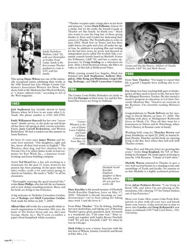 1985 From Tony Thatcher: “I’m happy to report that life is good! I happily have nothing else to report.” Eric Gross was busy teaching little guys in kindergarten all they need to know in life, but now he’s the Bilingual Resource Teacher. He also started a master’s program in education at Cal State University Monterey Bay. “Good to see everyone at the Reunion. I’m currently reading Melissa’s book.” Congratulations to Nicole DeFever on her marriage to David Martin on June 17, 2000. The wedding took place at Montgomery Redwoods Grove in Ukiah, CA. Then off they went for a honeymoon to Siberia and St. Petersburg, where Dave’s fluency in Russian came in handy.