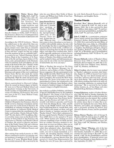 John E. Cahill, Sr., a construction contractor whose family-owned firm helped build San Francisco’s skyline, died Saturday, September 23, 2000. He is survived by his wife Helen, of San Rafael; three sons, John, Jr., of Kentfield, Gerald of Mill Valley, and Edward of Stockton; a daughter, Ann Fidanque of Eugene, Oregon; two brothers, Richard of Ross, and J. Peter, CdeP ’42, of Woodside; and 12 grandchildren including Kimberly, CdeP ’99, Kevin ’01, and Chris ’03. Florence Ehrhardt, widow of Thacher’s Music Director from 1946 to 1977 C. Michael Ehrhardt, died on August 10, 2000. She is survived by their four children: Gina, Michael, CdeP ’62, Modena, and Rebecca. Helen I. Lochrie, who for many years worked as Thacher’s admission secretary, died Saturday, August 12, 2000 at Acacias Care Center in Ojai. She was very detail-oriented and assured that “all loose ends were tied,” according to Jack Huyler. “She could deal efficiently with almost anything that had to do with college counseling, admission, or assistant headmastering.” She is survived by her brother Arthur Lockrie, Jr., of San Diego and sister Elizabeth Hoag McGlynn of Monterey. Carmen Robertson, mother of Sydney Robertson, CdeP ’80, died on Tuesday, September 26, 2000, following a traffic accident in which her husband, Jack, was also injured. She’s credited for organizing the art in Ojai, and making it the artistic mecca that it is today. She is survived by her husband; four sons: Nick, Drew, Winslow, and Cullen; one daughter, Sydney, who is presently working for School Year Abroad in Rennes, France; and five grandchildren. Helena Duryea Thacher, wife of George B. Thacher, CdeP ’20, died on June 27, 2000. She is also survived by sons: Philip, CdeP ’54, and John, CdeP ’57; and grandchildren: Nara, Jeffrey, Peter, CdeP ’84, Sherman, and Thomas, CdeP ’87. Virginia “Murps” Wheaton, wife of the late former Trustee George S. Wheaton, CdeP ’23, died Sunday, September 17, 2000. She is survived by two sons: George S. III, CdeP ’51, and John R., CdeP ’56; five grandchildren; and four great grandchildren. A memorial service was held at Casa Dorinda in Santa Barbara on Friday, September 29, 2000. e Spring/Summer 2000