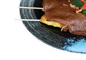 Kipsaté, kip omhuld in pandanblad en gebakken loempia.