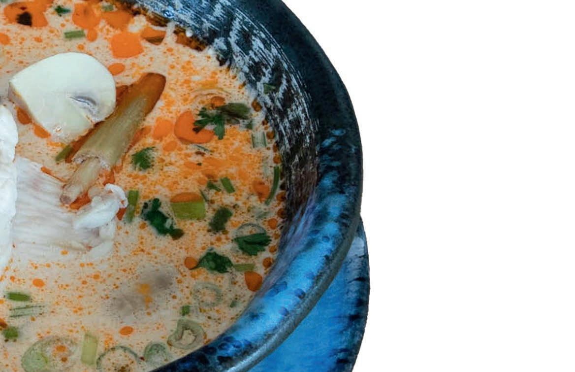 Spicy Tom Kha Kai chicken soup with galangal and coconut milk.