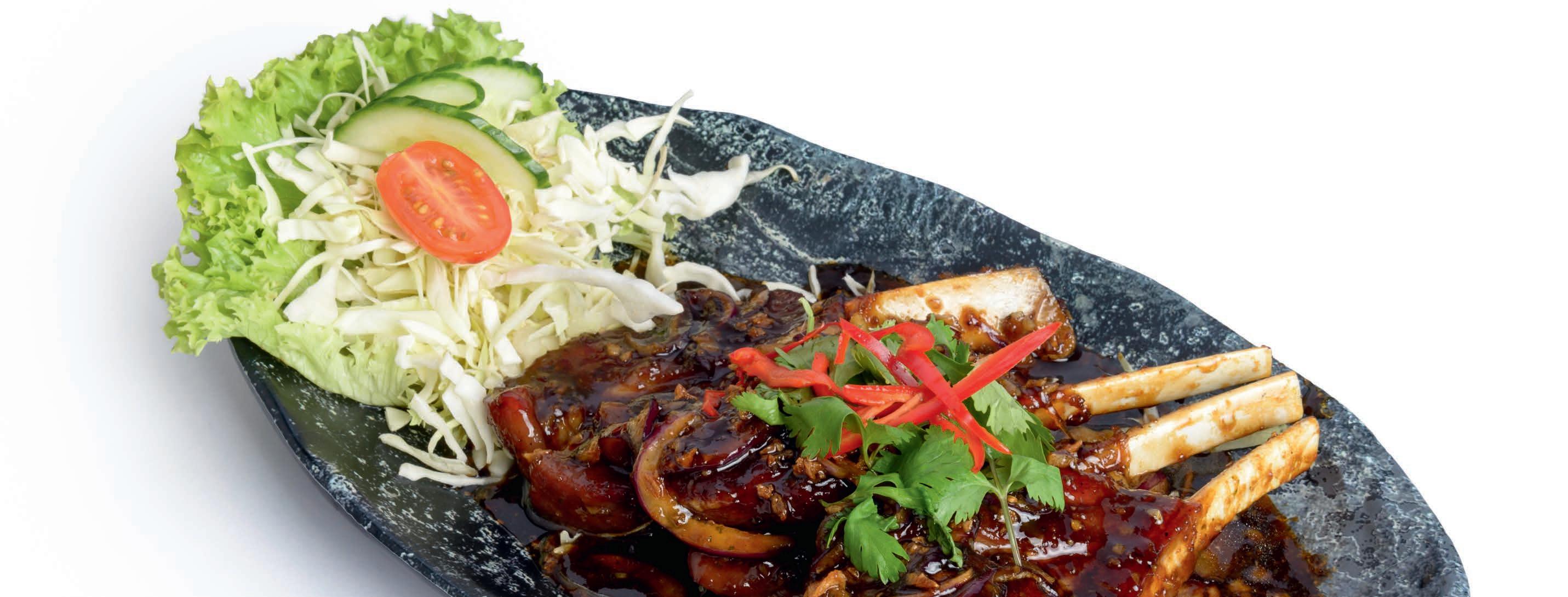 Lamb chops with spicy sauce, Thai basil and various vegetables