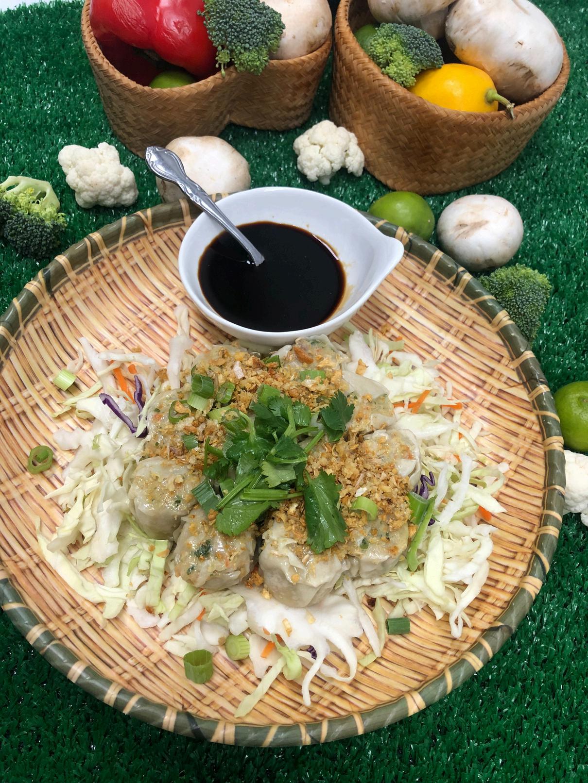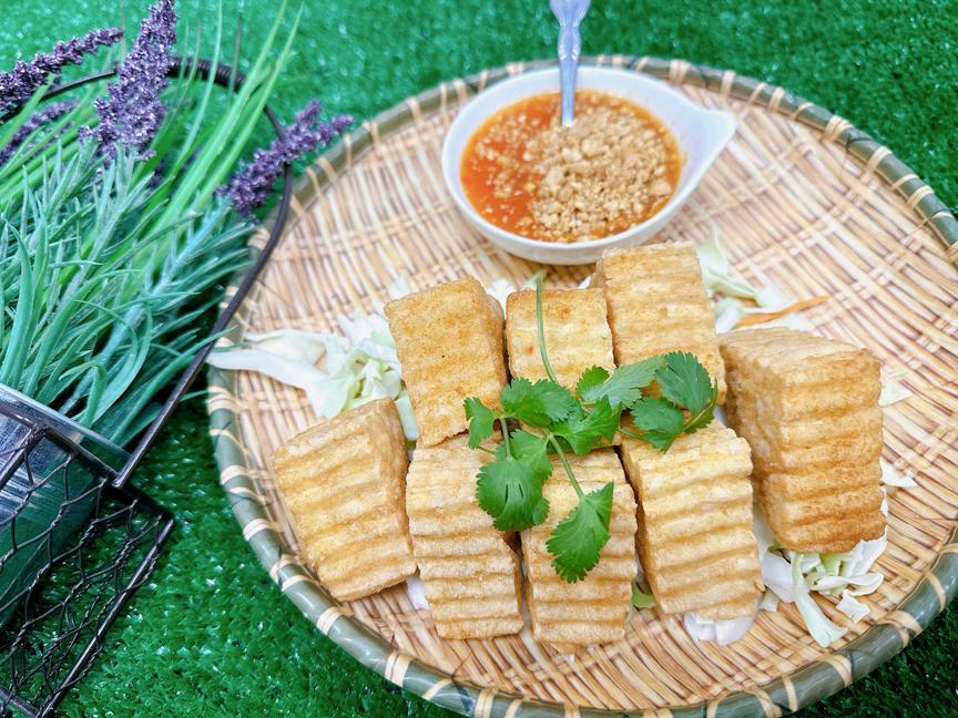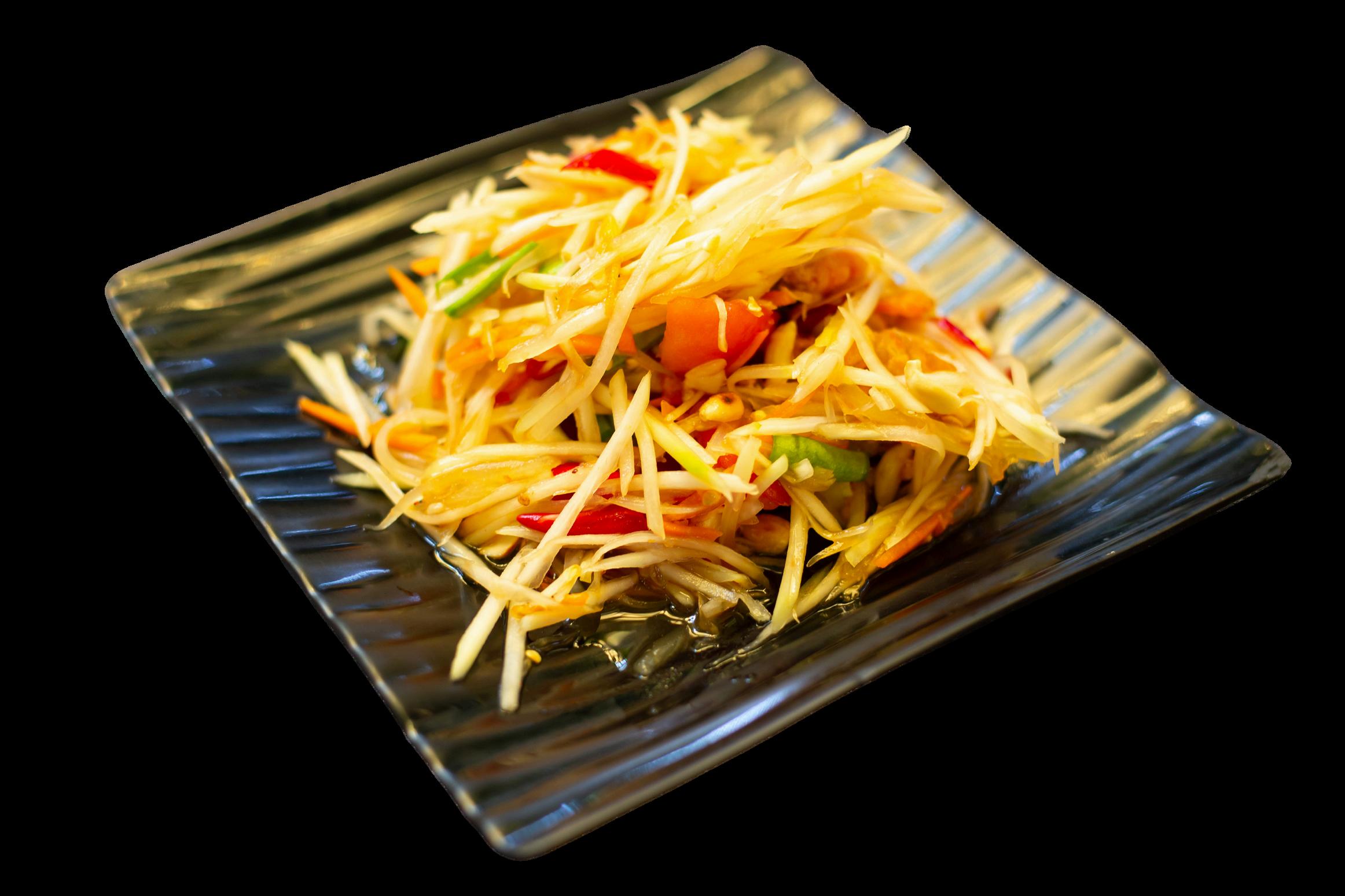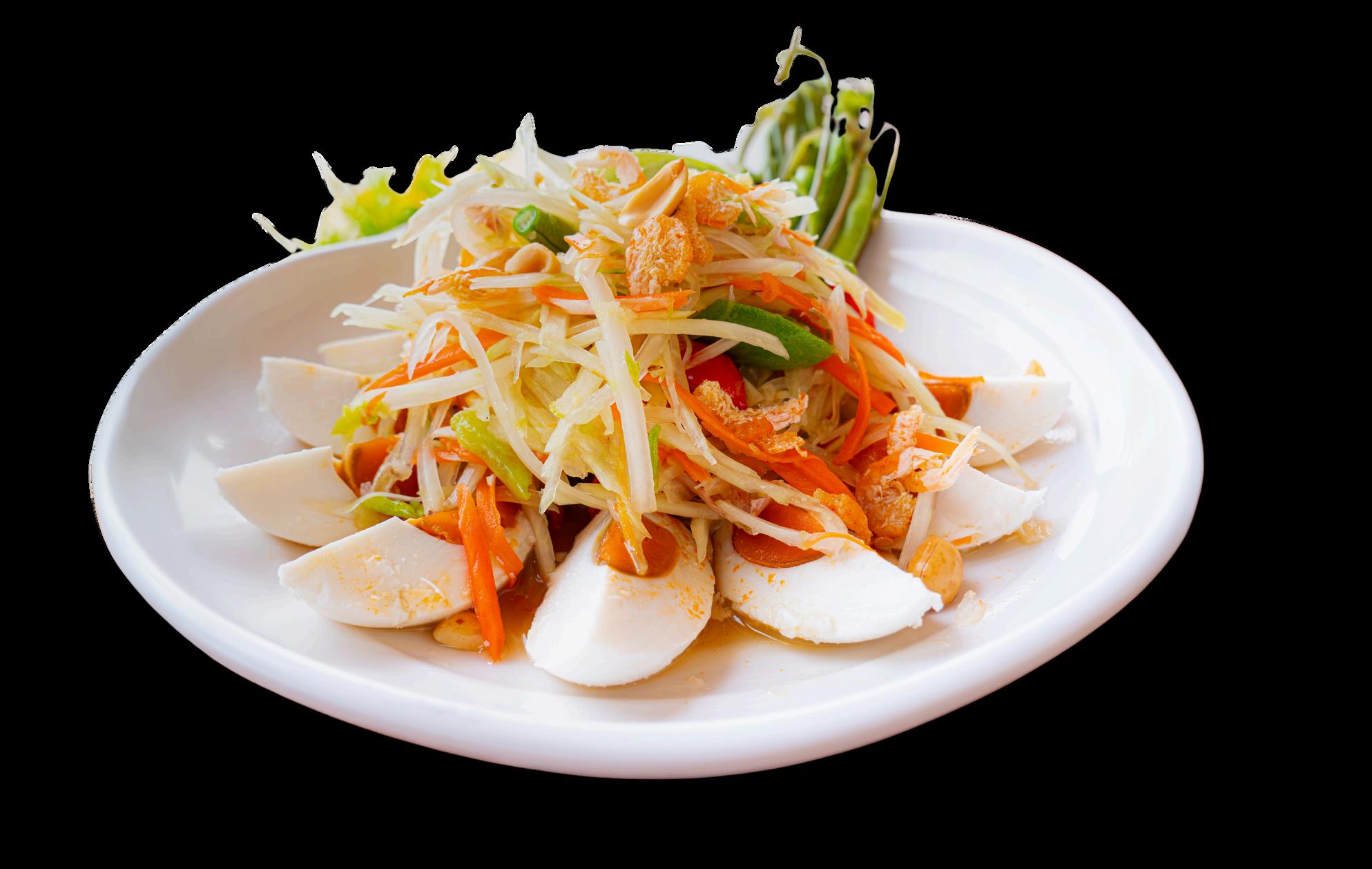 Fried tofu (4 pc), papaya, green bean, tomato, peanut, carrot in vegan lime dressing bed of shredded cabbage.