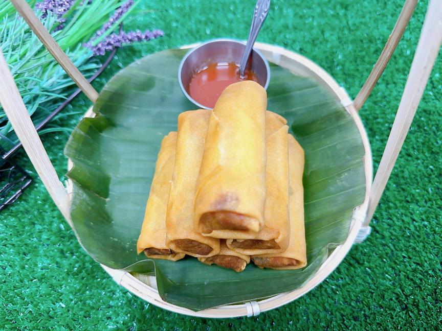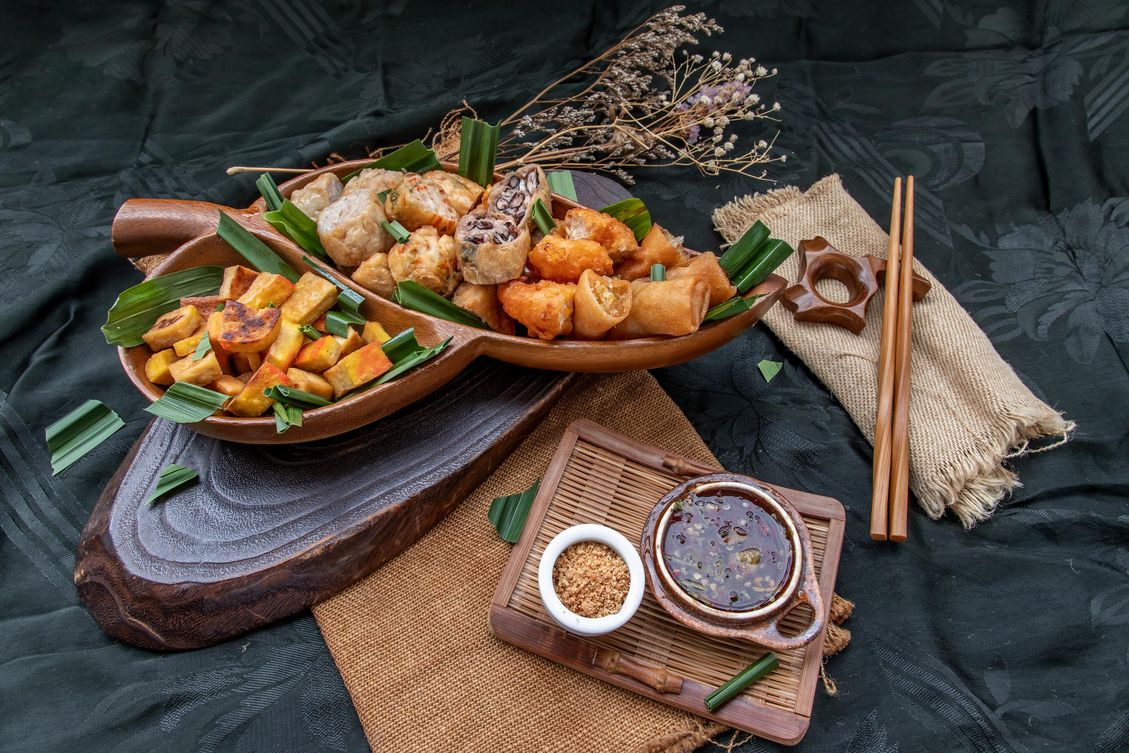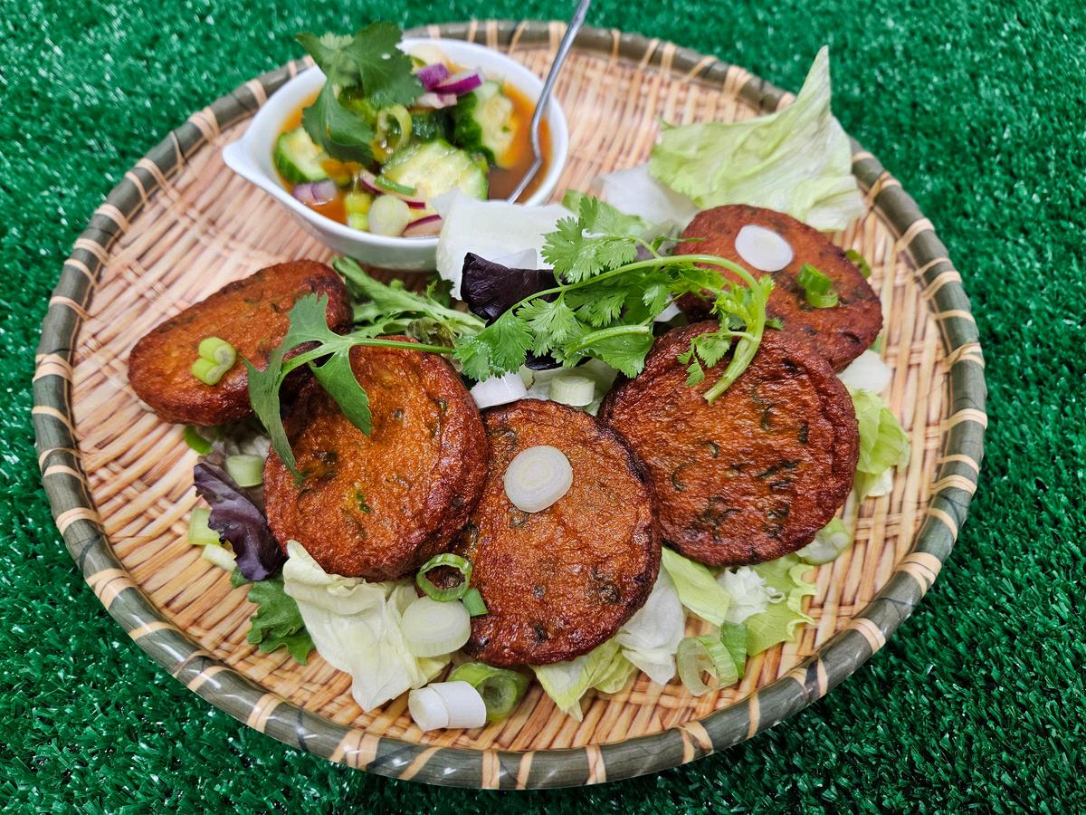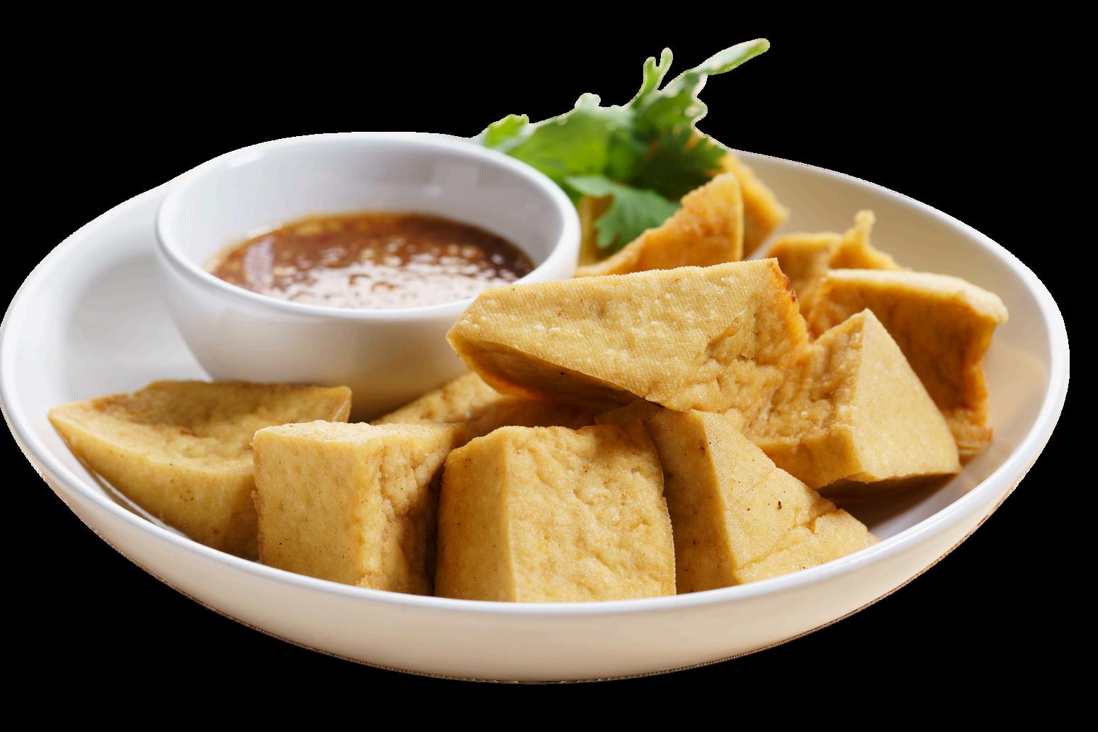 Fried tofu (4 pc), papaya, green bean, tomato, peanut, carrot in vegan lime dressing bed of shredded cabbage.