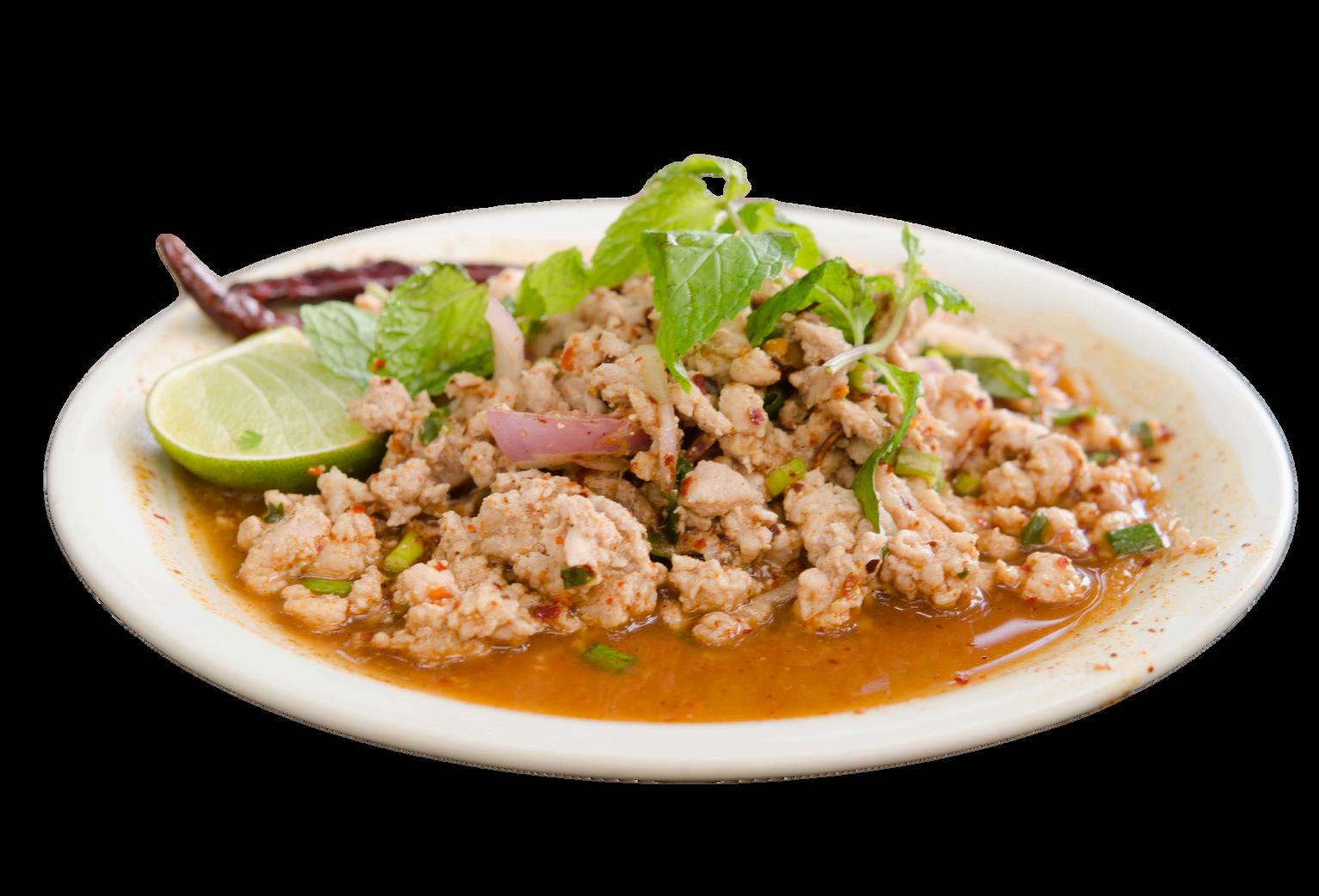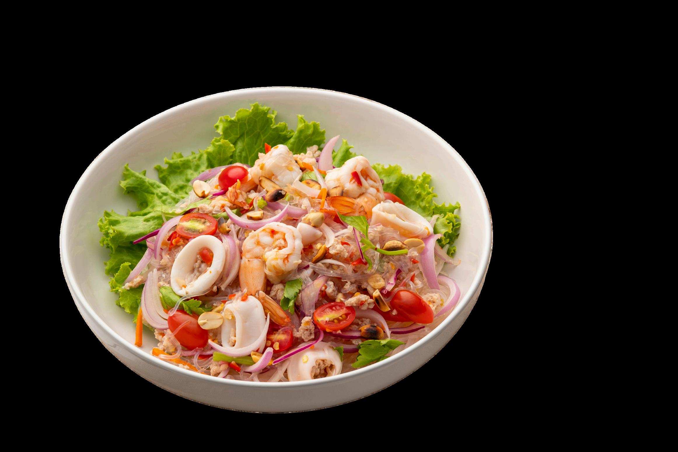 Shrimp, chicken, calamari, red onion, carrot, peanut, mint, tomato, fried garlic, scallion, cilantro in lime dressing.