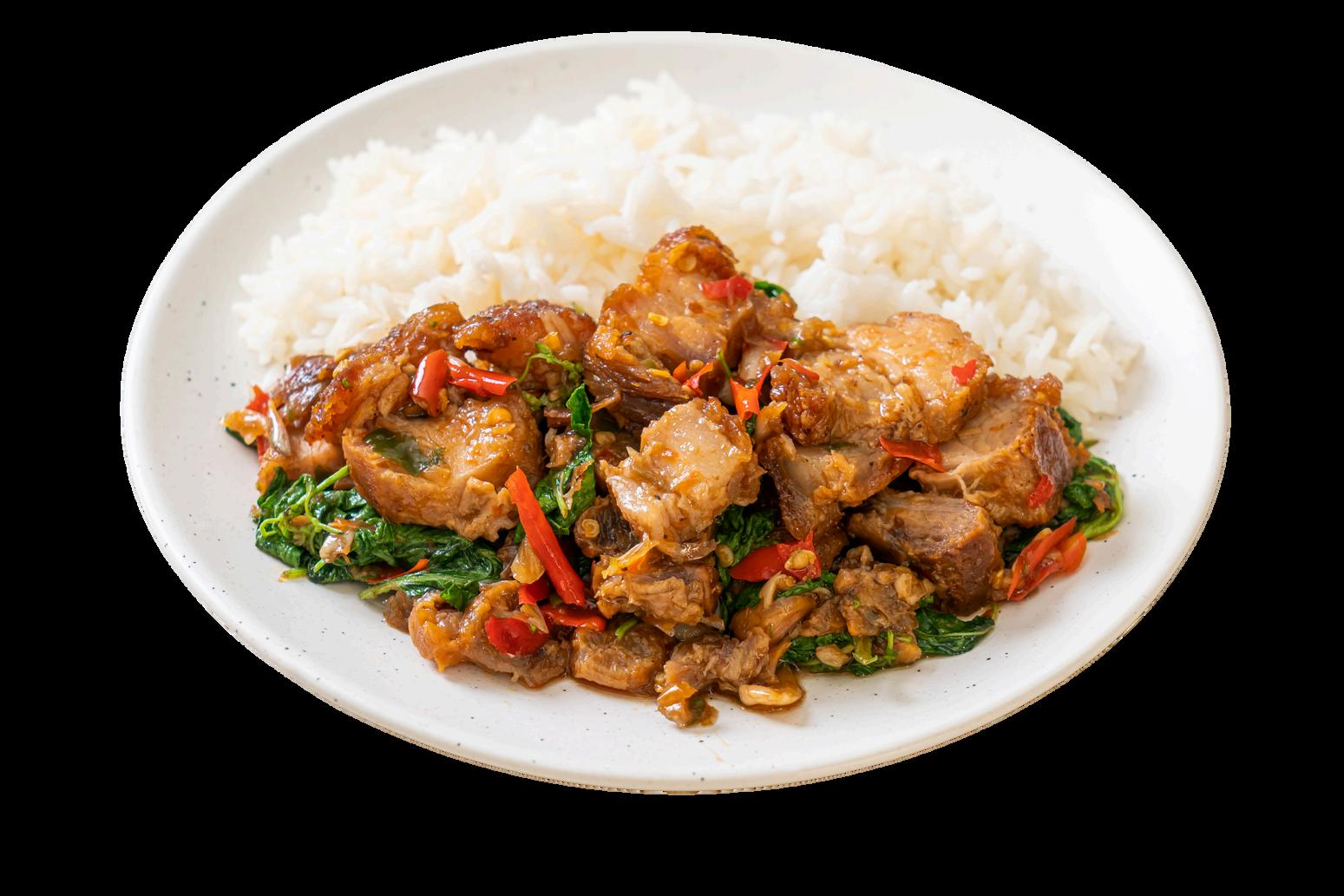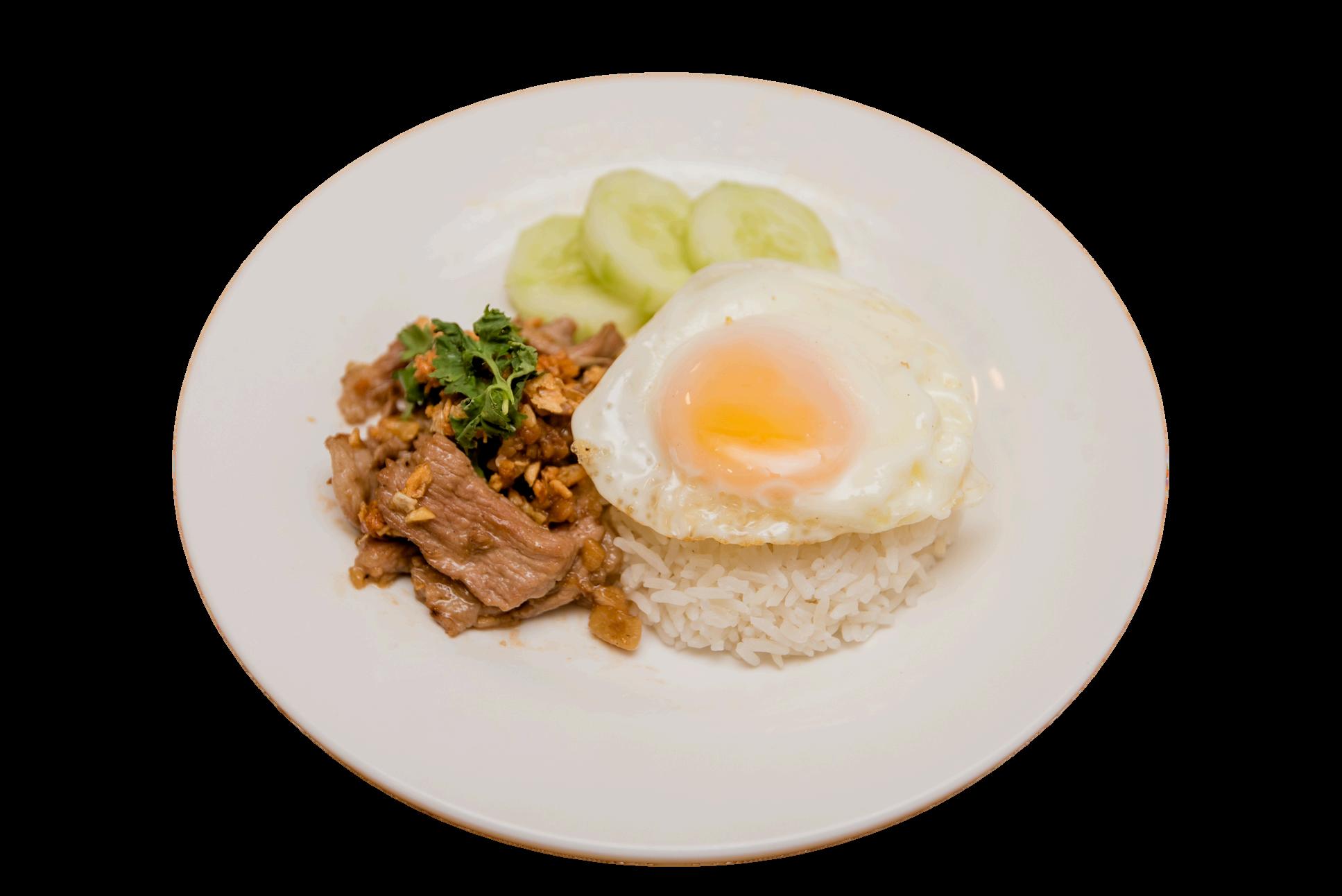 Choice of meat, egg, chinese broccoli, onion, tomatoes, scallions, cilantro and fried garlice.