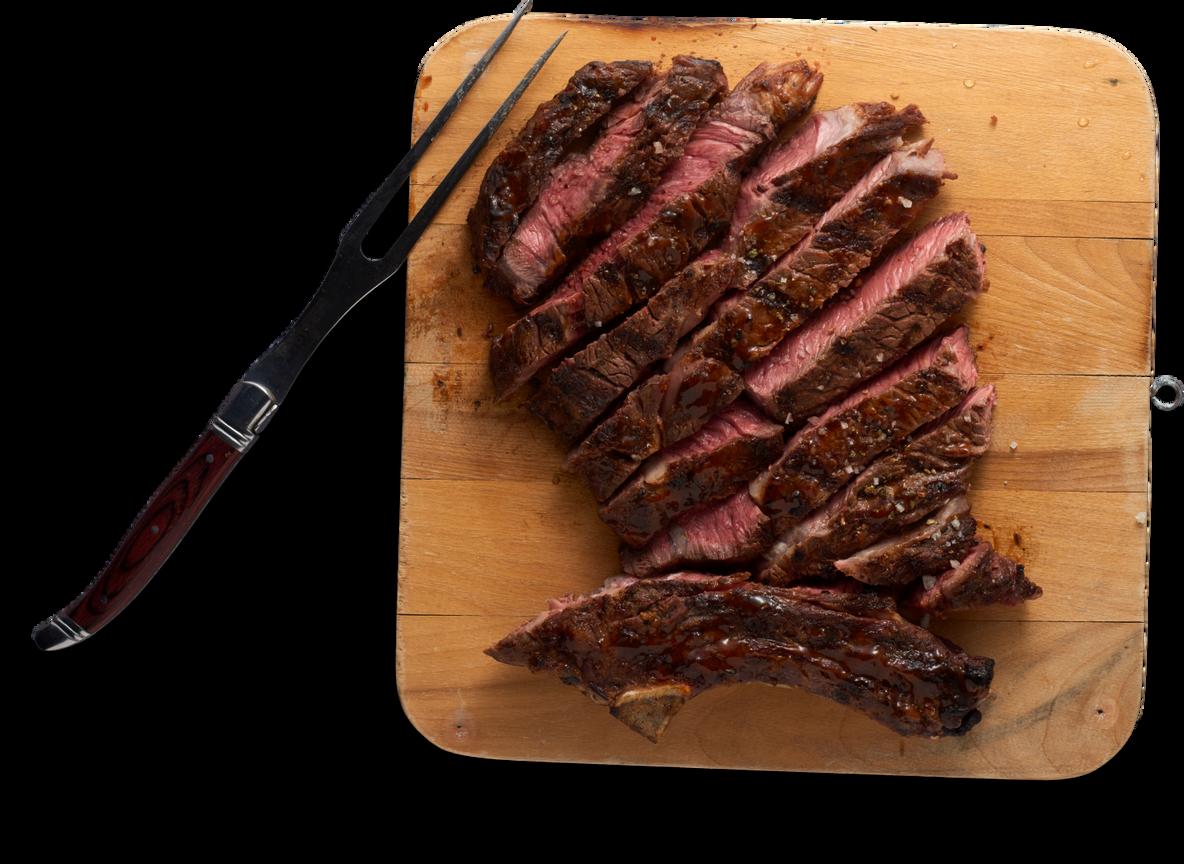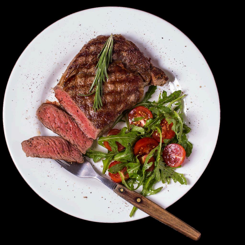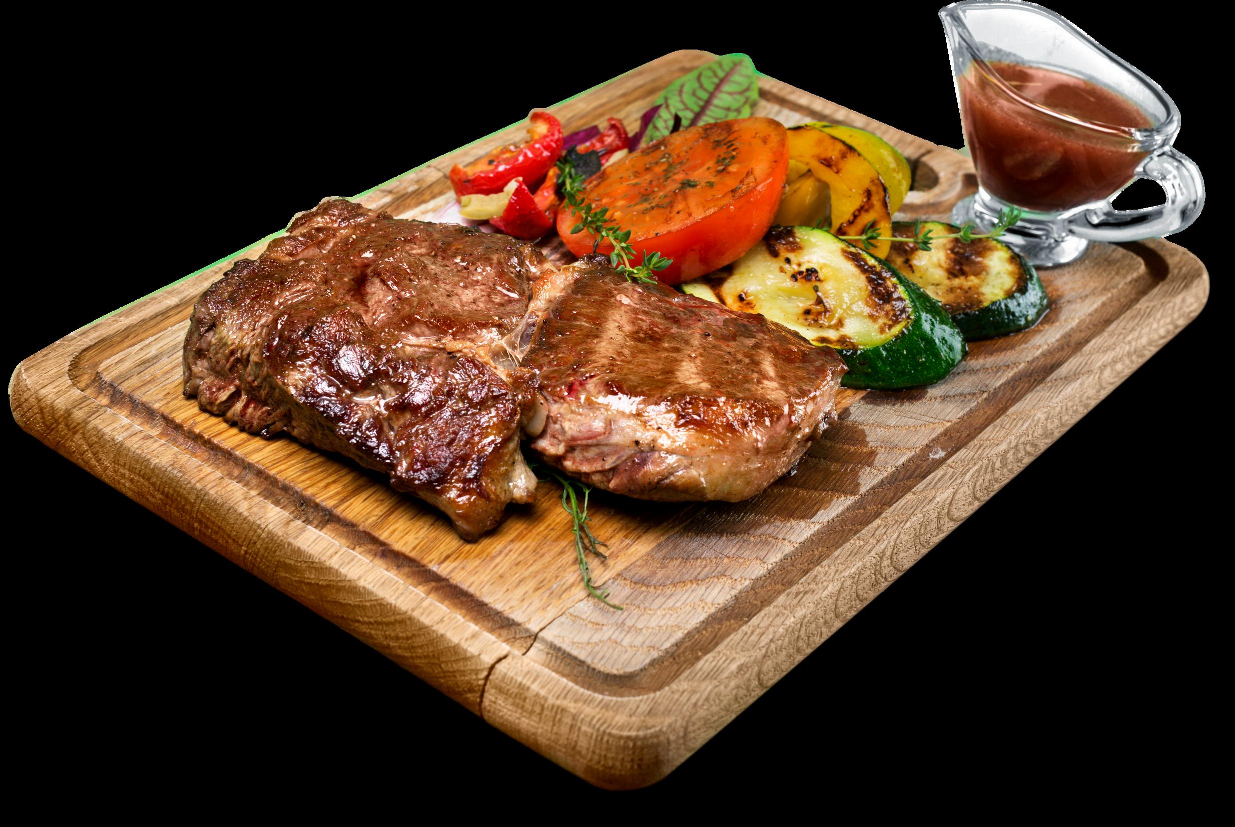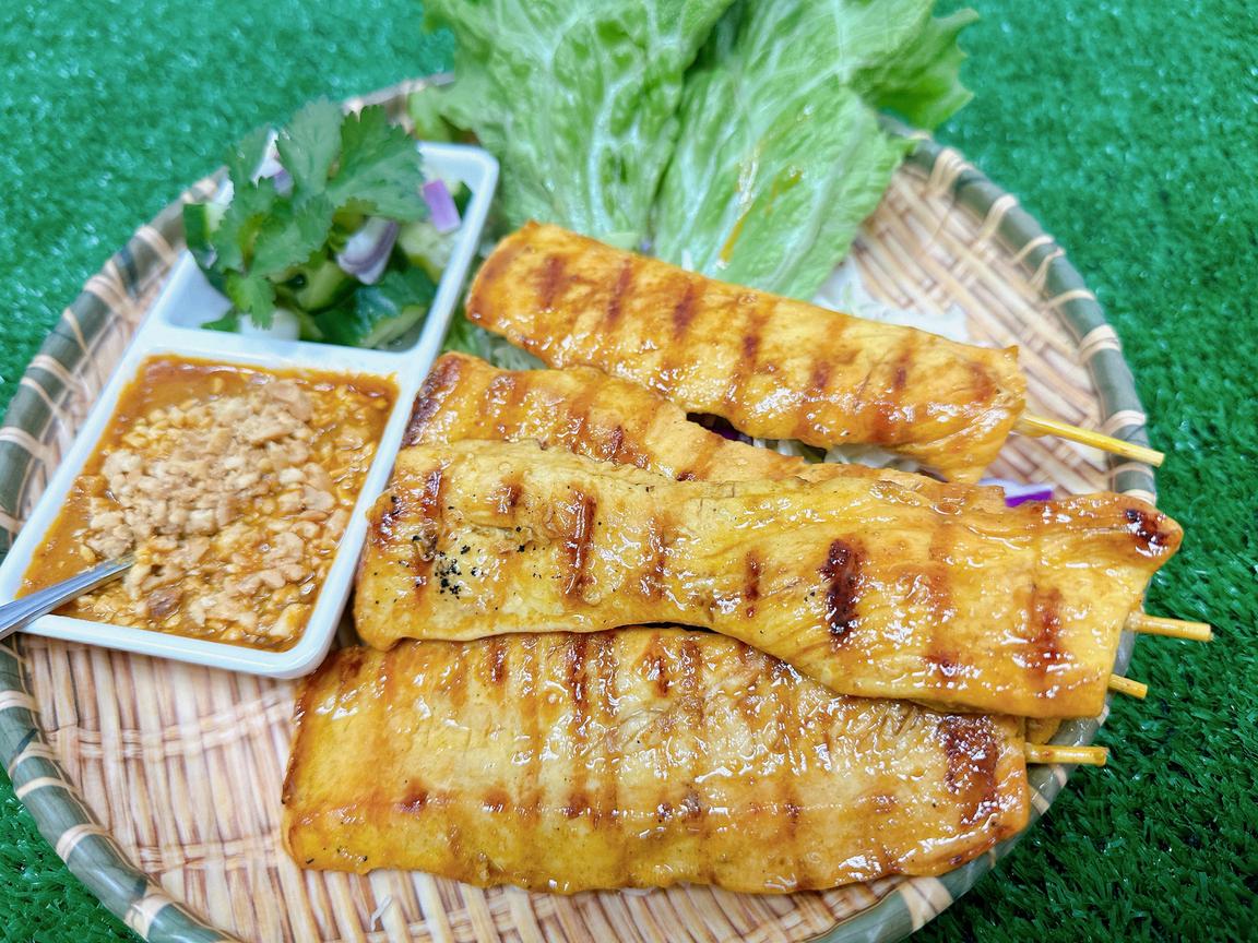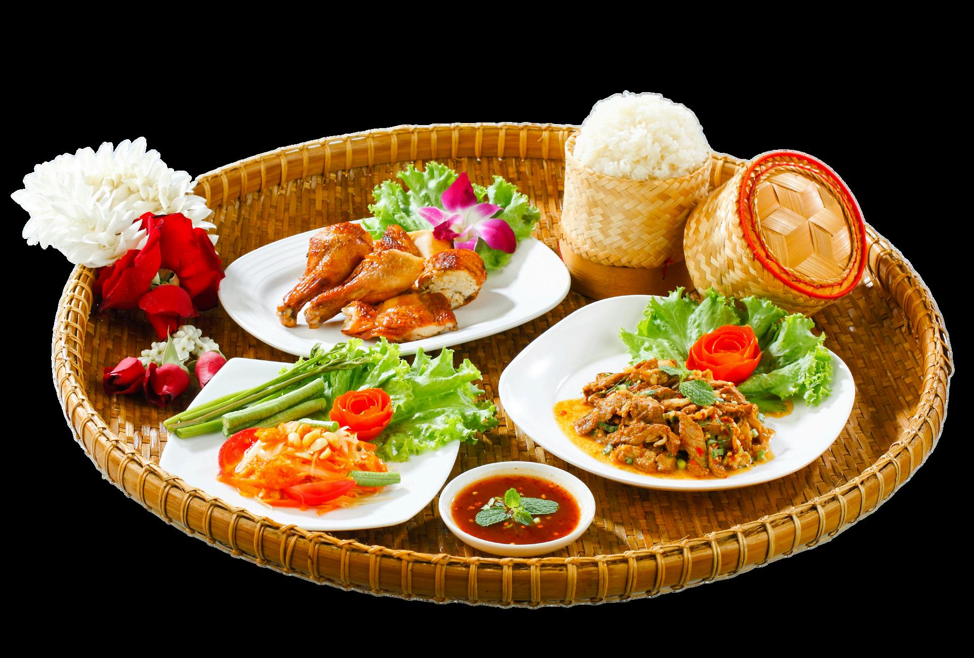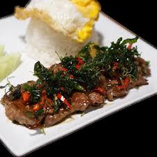 Grilled Thai style rib eye steak with special Thai sauce, cila tomato, cucumber bedded of springs mixed.