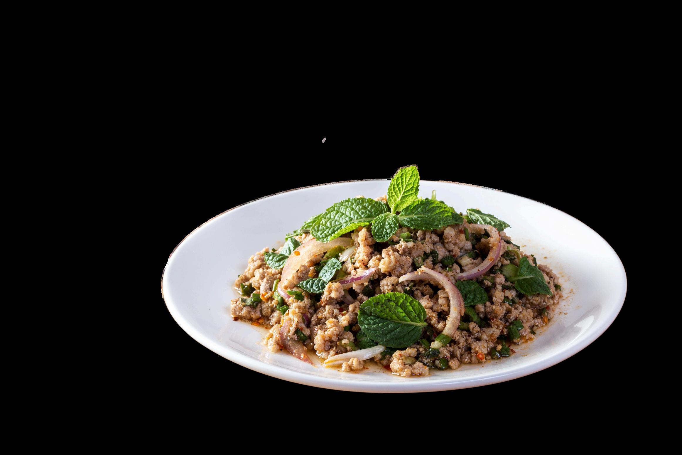 Red onion, mint, cilantro, scallion, cucumber, fried garlic, ground roast rice in lime dressing, bedded of shredded cabbage.