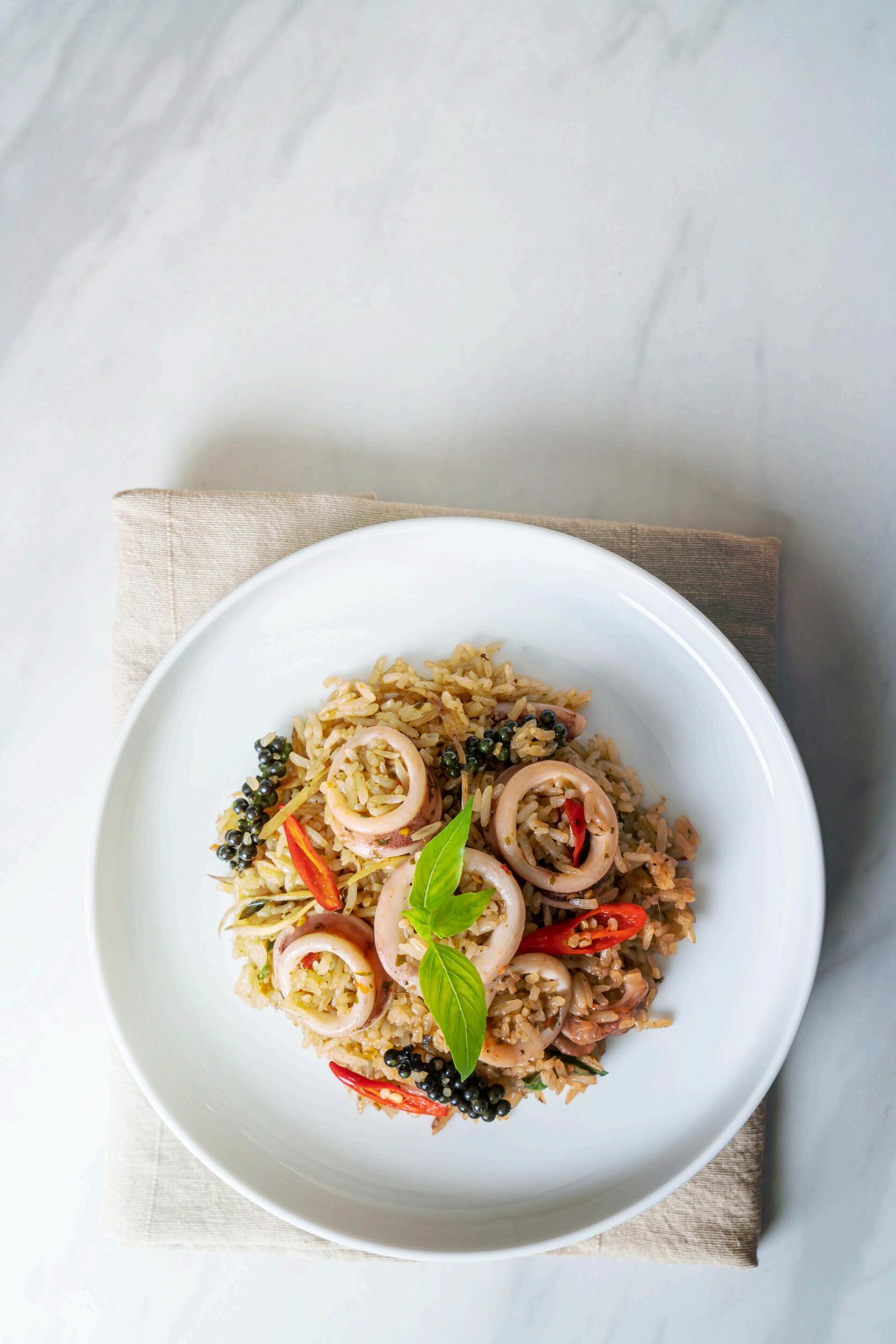 Egg, bell pepper, onion, basil, green bean, young pepper corn and fried garlic.