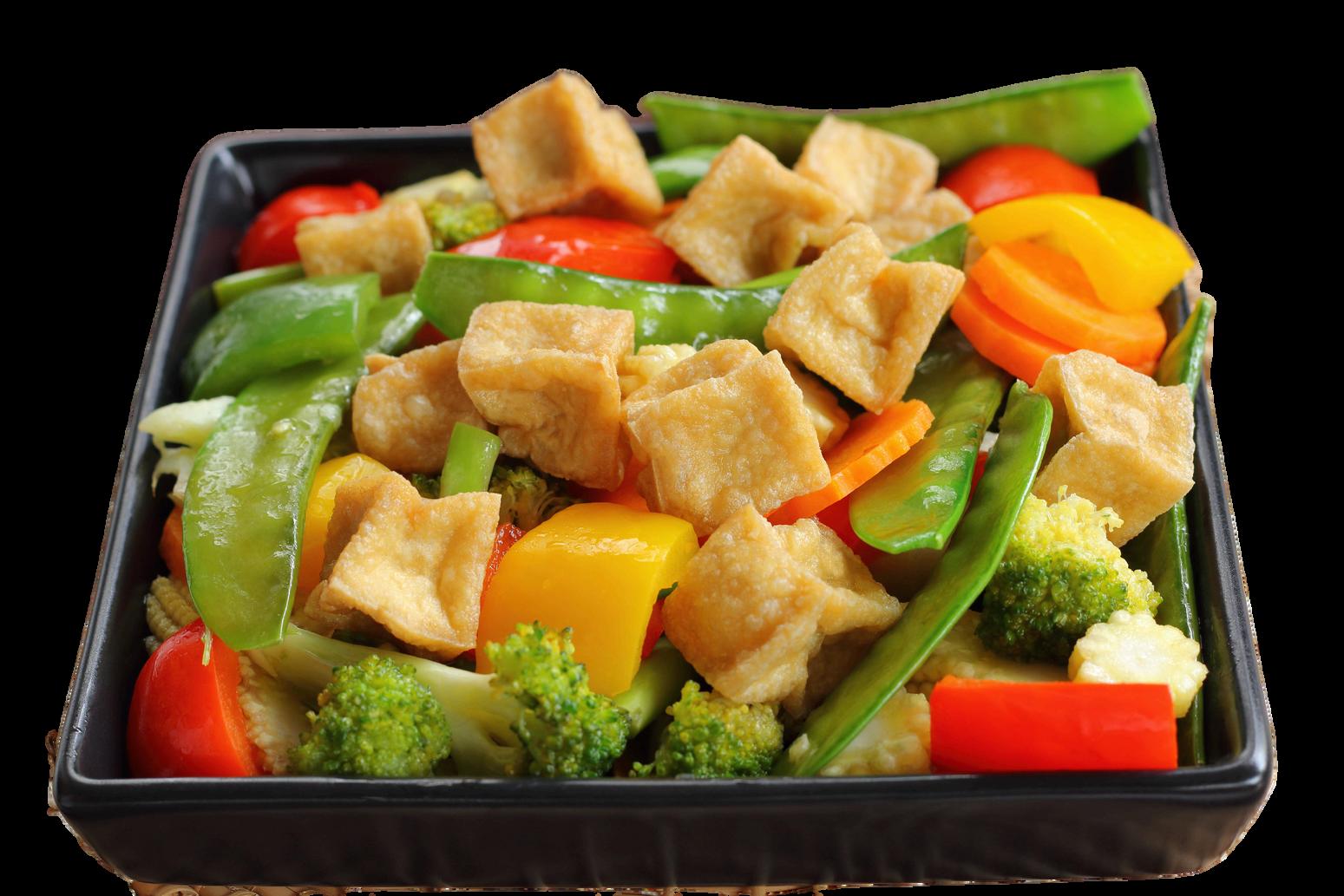Jasmine rice, fried tofu and mixed veggie in vegan sauce.