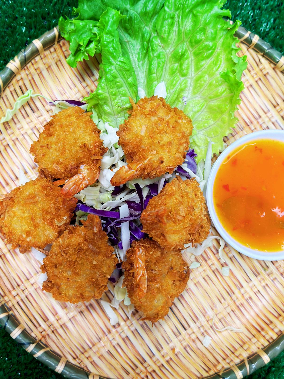 Shrimp (2 pc), green bean, tomato, peanut, carrot, in fish sauce lime dressing bed of shredded cabbage.