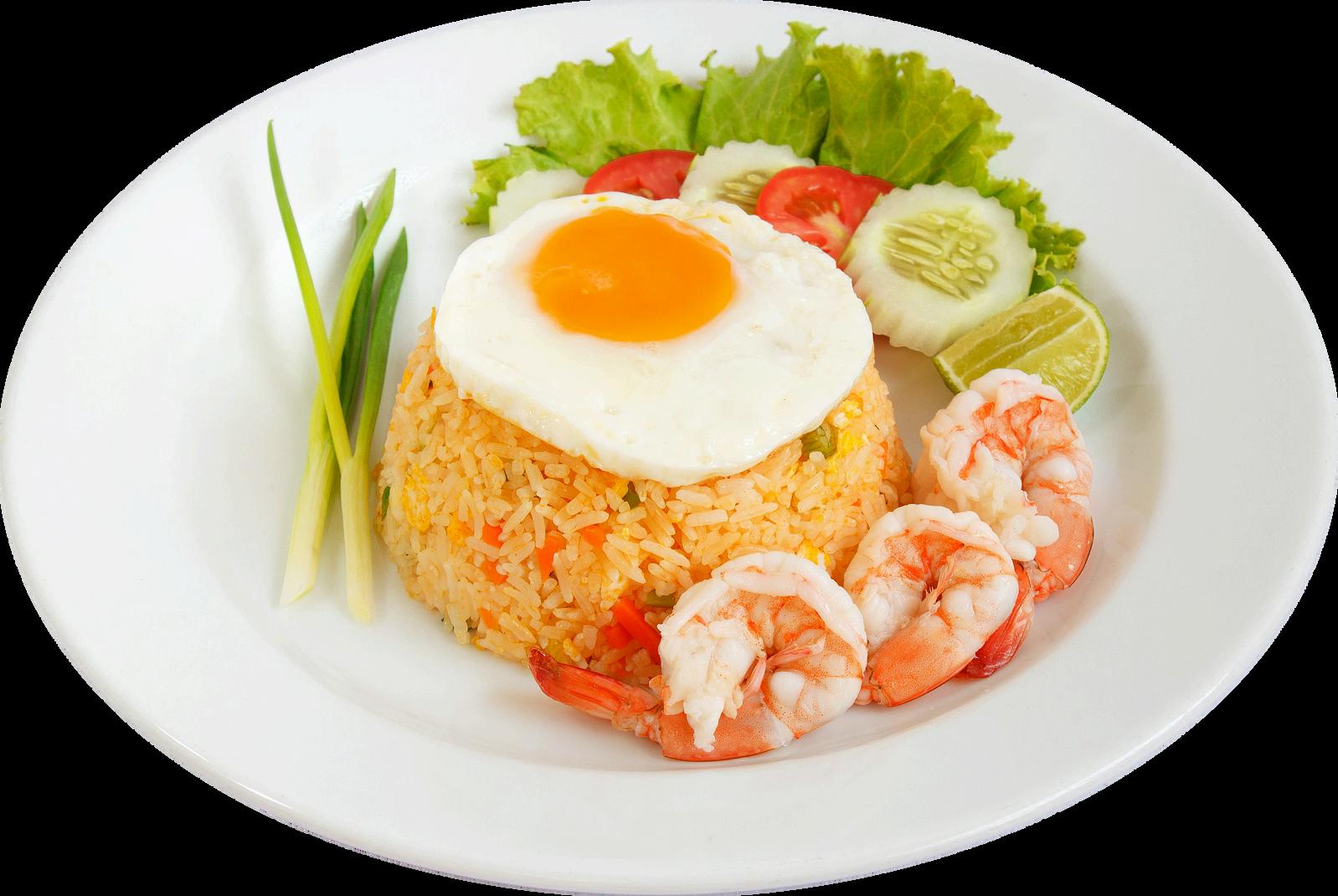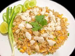 Shrimp and chicken, pineapple, cashew nut, pea carrot, raisin, egg, scallion, cilantro, fried garlic cooked in turmeric flavor