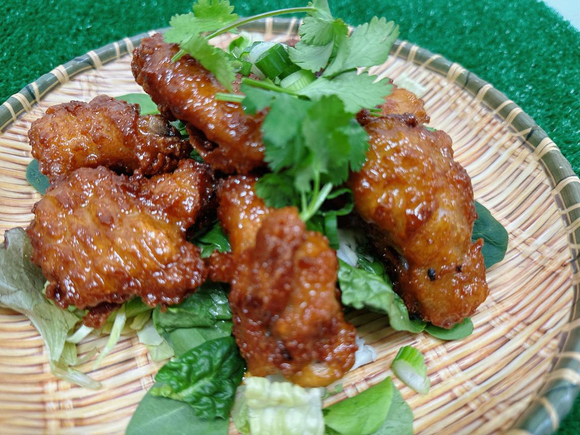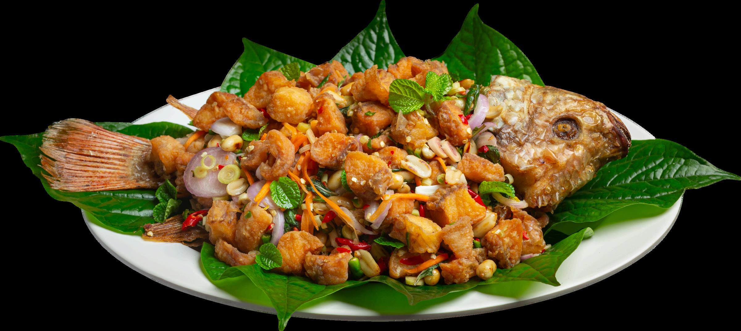 Deep fried lightly battered in house sauce with carrot, onion, bell pepper, fried garlic, scallion and cilantro.