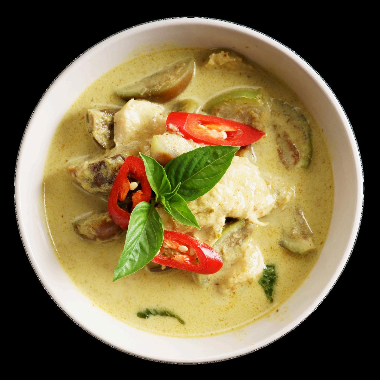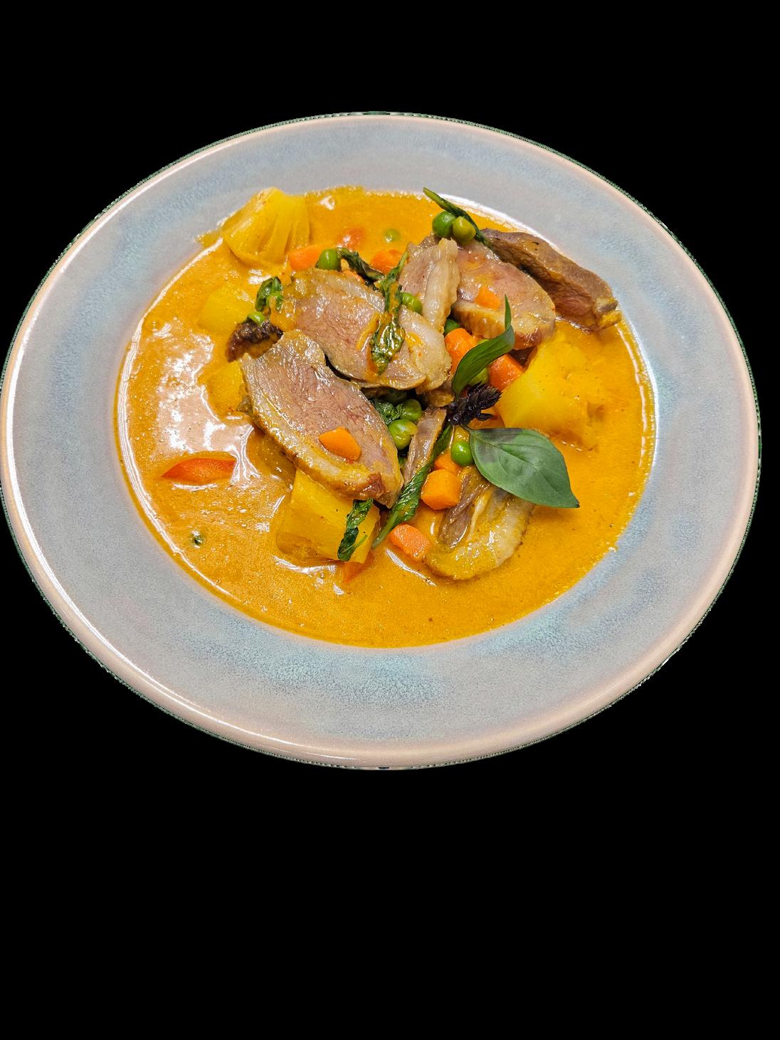 Red curry in coconut milk, bell pepper, pineapple, pea & carrot, tomato & basil.