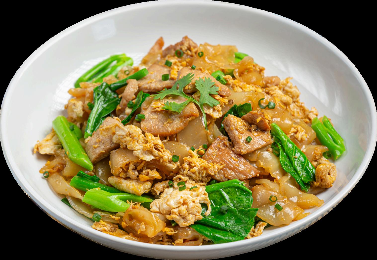 Flat rice noodles, Cabbage, mushroom, bell pepper, onion, tomato, green bean and basil